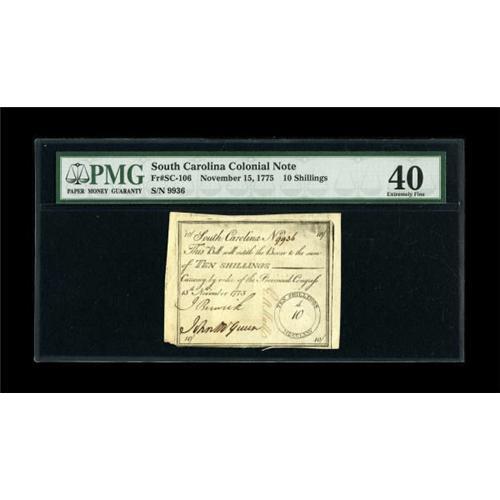 <B>South Carolina November 15, 1775 10s PMG Extremely Fine 40.</B></I> An incredibly underrated issue and one of the nicest examples we've seen or handled of this denomination until we saw the preceding note. This is a chance for another lucky bidder to add this elusive note to their collection. <BR><BR><b>Shipping:</b> Coins & Currency (<a target="_blank" href="http://www.heritageauctions.com/common/shipping.php">view shipping information</a>)