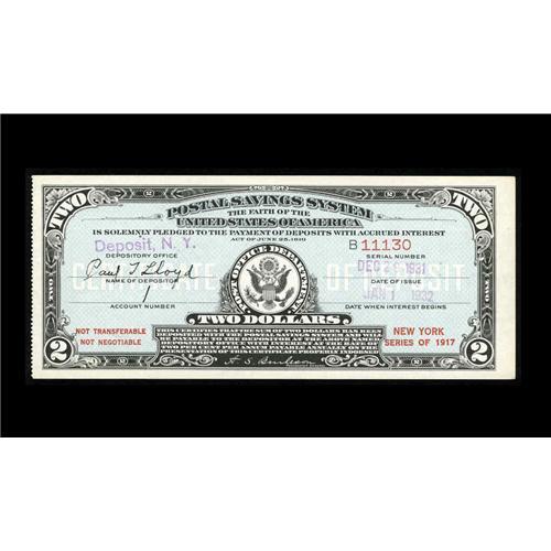 <B>Postal Savings System Series 1917 $2 New York Overprint Certificate.</B></I> This is one of the scarcer varieties for this series where the state of issue is overprinted on the certificate.