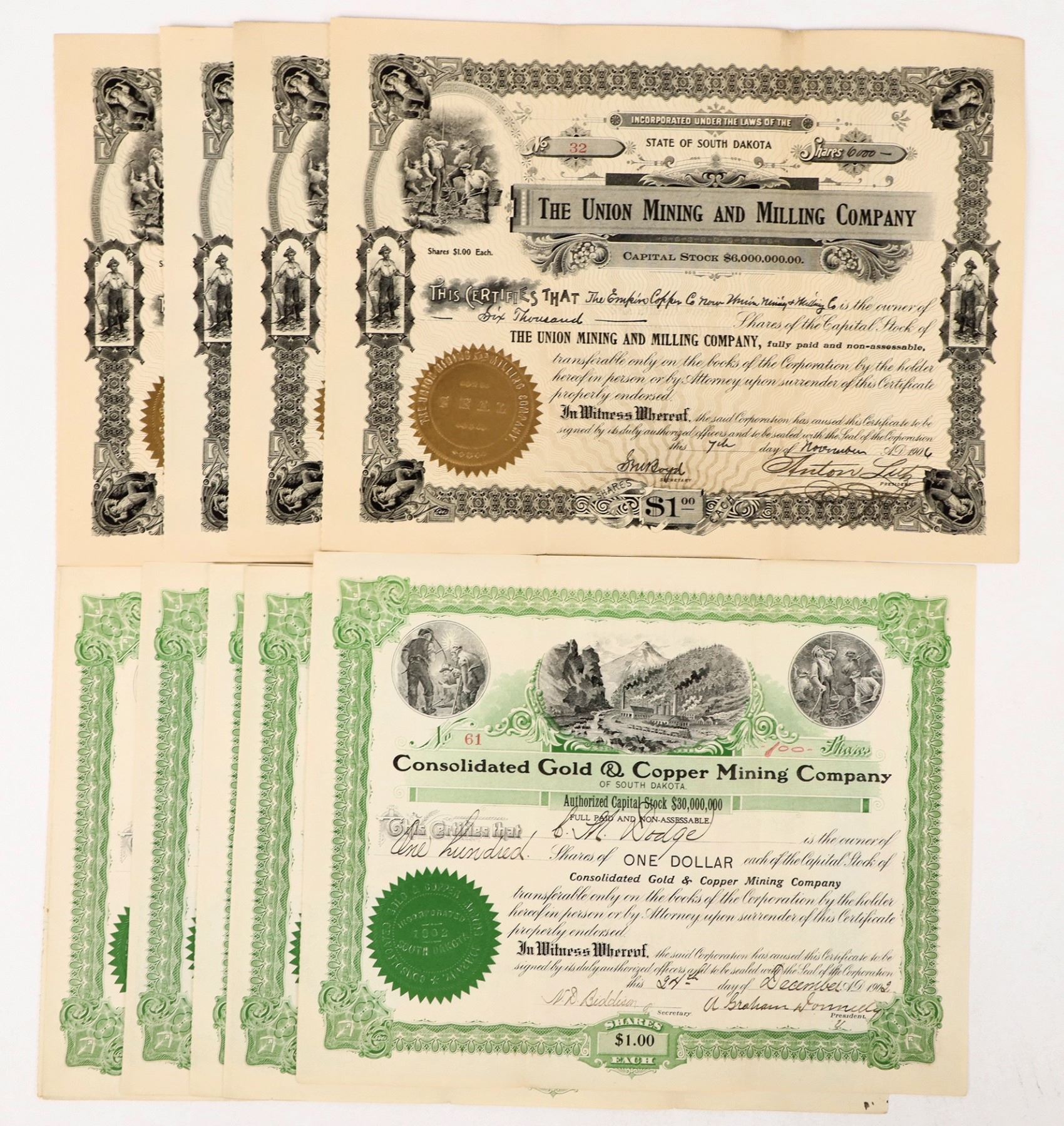 9 South Dakota Mining Stocks, 2 different c.1905 The Union Mining and Milling Company and Consolidated Gold & Copper Mining Company. All issued, some endorsed on reverse. See photo.