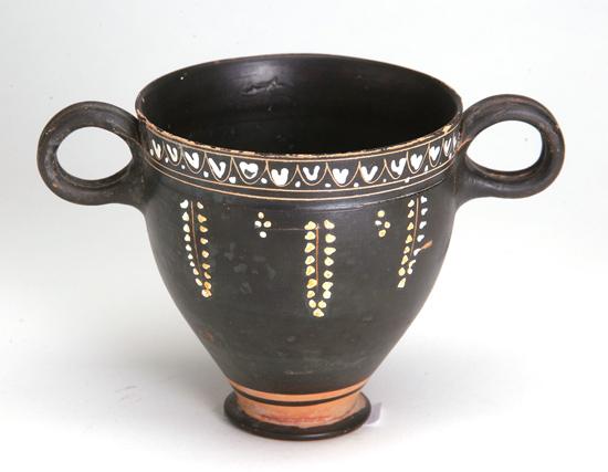 South Italian Apulian Gnathian Kotyle, circa 350 B.C. Deep skyphos cup with twin handles in vertical position to rim. Well decorated in black glaze with incised ochre and added white slip band. Intact, free from repairs. Height 5½".