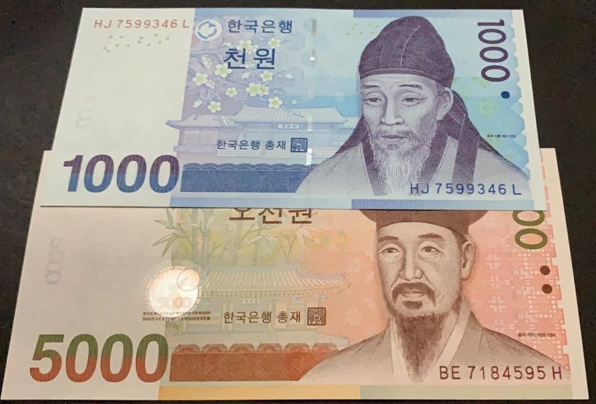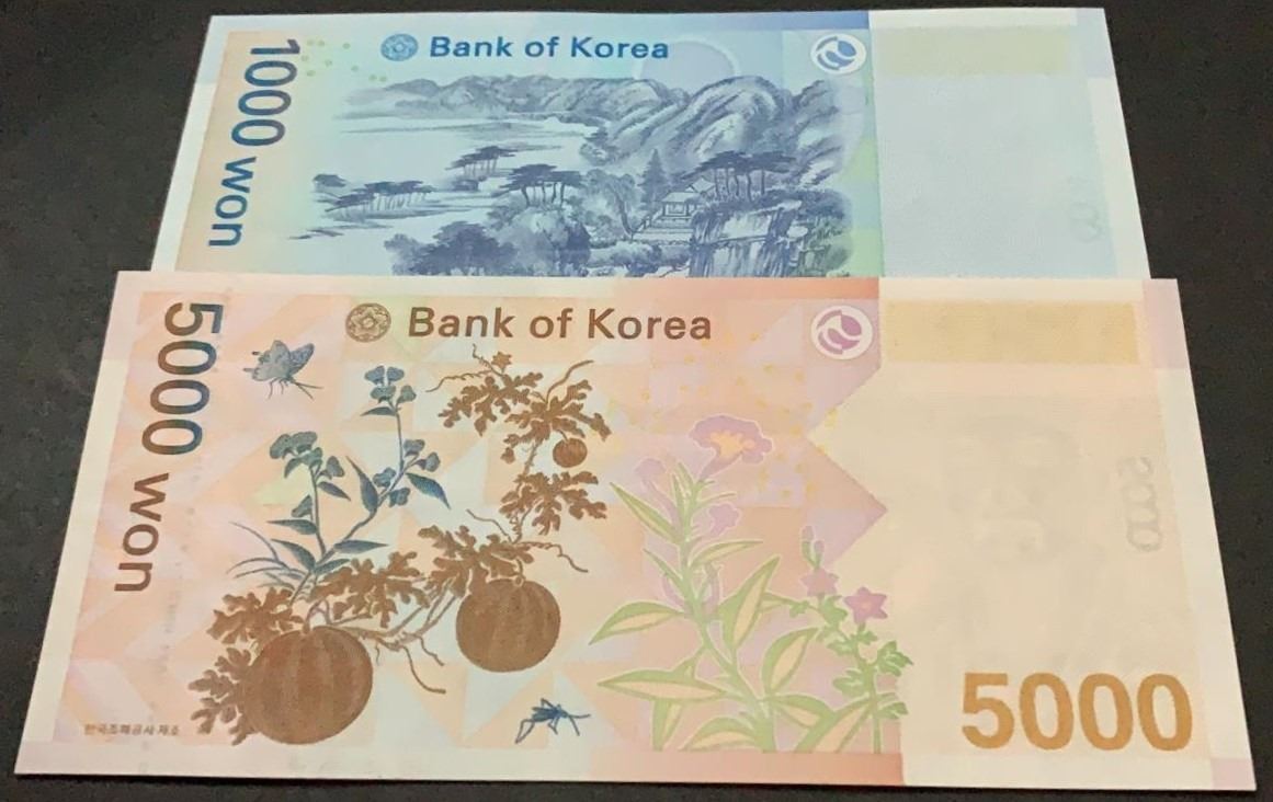 South Korea, 1.000 Won and 5.000 Won, 2006/2007, UNC, p54, p55, (Total 2 banknotes)br/serial number: HJ 7599346L, BE 7184595H