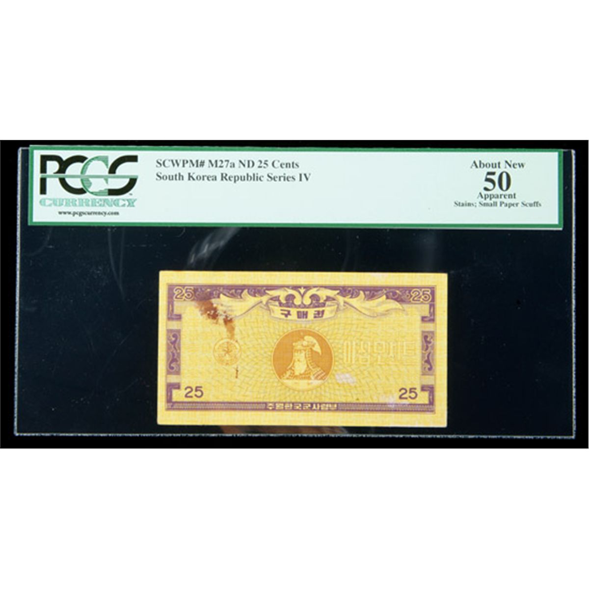 South Korea SCWPM# M27a, ND Series IV 25 Cents. PCGS About New 50 Apparent. . Fr-P-M27a. A scarce Military issue note, similar to U.S. MPcs and used during the Vietnam conflict. PCGS notes some stains and small paper scuffs.