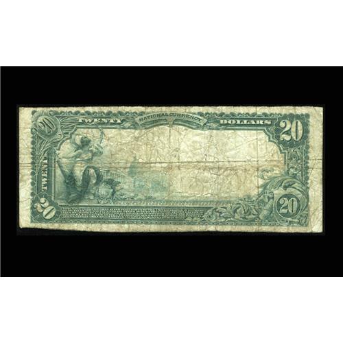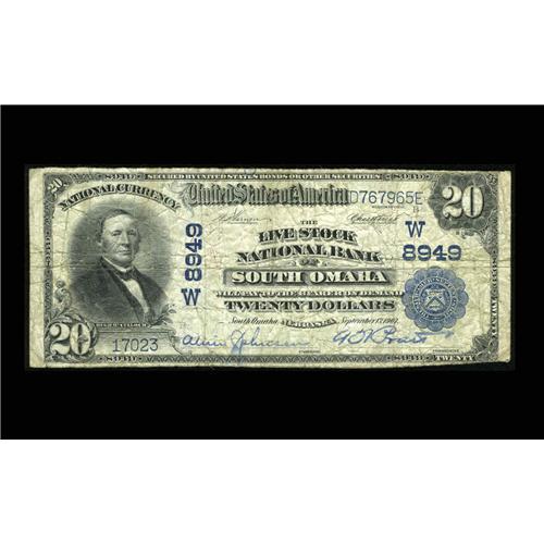 <B>South Omaha, NE</B></I> - $20 1902 Plain Back Fr. 652 <B>The Live Stock NB</B></I> Ch. # (W)8949<BR>Four of the five note issuing national banks in South Omaha had bank titles directly linked to the cattle industry. Dark blue stamped signatures are a highlight of this $20 that is just one of four 1902 $20s in the total census of 17 Large for this bank. <B>Fine.</B></I>