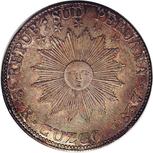 <B>South Peru. Republic 8 Reales 1837-BA Cuzco, </B></I>KM170.1, MS62 NGC, rare raised edge variety, only about five known examples. A choice deeply toned specimen with unusually sharp design details. Ex-SBC auction of Sept 1998, "100 Classic Crowns."