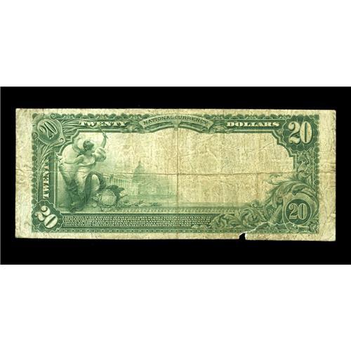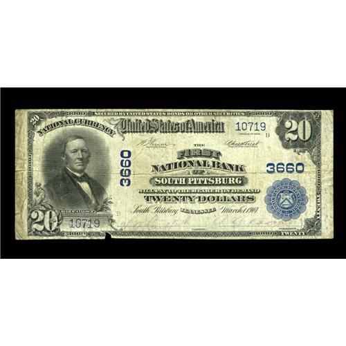 <B>South Pittsburg, TN</B></I> - $20 1902 Plain Back Fr. 652 <B>The First NB </B></I> Ch. # 3660<BR>This institution is very rare in large size with this $20 being a new addition to the Kelly census, which now numbers five. This note has a large tear and is missing a sliver of the note at the tear. <B>About Fine.</B></I>