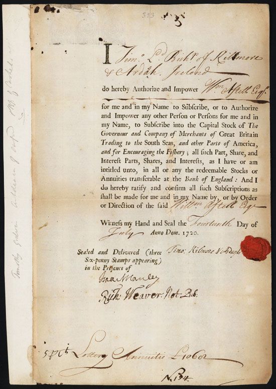 Britain, July 14th, 1720, Power of Attorney for subscribing in capital stock, Printed in black with no vignettes, 3 Six Pence stamp imprints top left, Red wax seal mid right side, Fine condition. South Sea Co. was incorporated in 1711 and had exclusive trading right to Spanish South America. Main purpose of the company was to fund the government debt incurred during the War of Spanish Succession. Speculation in the stock then led to the famous South Sea Bubble in 1720. (Sotheby's Lot 591 date (?)).