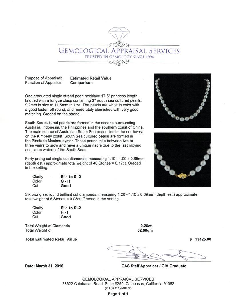 One graduated single strand pearl necklace 17.5" princess length, knotted with a tongue clasp containing 37 south sea cultured pearls, 9.2mm in size to 11.5mm in size. The pearls are white in color with a good luster, off round, and moderately blemished with very good matching. Graded on the strand. South Sea cultured pearls are farmed in the oceans surrounding Australia, Indonesia, the Philippines and the southern coast of China. The main source of Australian South Sea pearls lies in the northwest on the Kimberly coast. South Sea cultured pearls are formed in the Pinctada Maxima oyster. These pearls take between two to three years to grow and have a unique nacre due to the fast moving and clean waters of the South Seas. Forty prong set single cut diamonds, measuring 1.10 - 1.00 x 0.65mm (depth est.) approximate total weight of 40 Stones = 0.17ct. Graded in the setting. Clarity: SI-1 to SI-2. Color: G - Good Six prong set round brilliant cut diamonds, measuring 1.20 - 1.10 x 0.69mm (depth est.) approximate total weight of 6 Stones = 0.03ct. Graded in the setting. Clarity: SI-1 to SI-2. Color: H - I. Cut Good. Total Weight of Diamonds 0.20ct. Total Weight of 62.60gm GAS Appraised at $13,425.00.