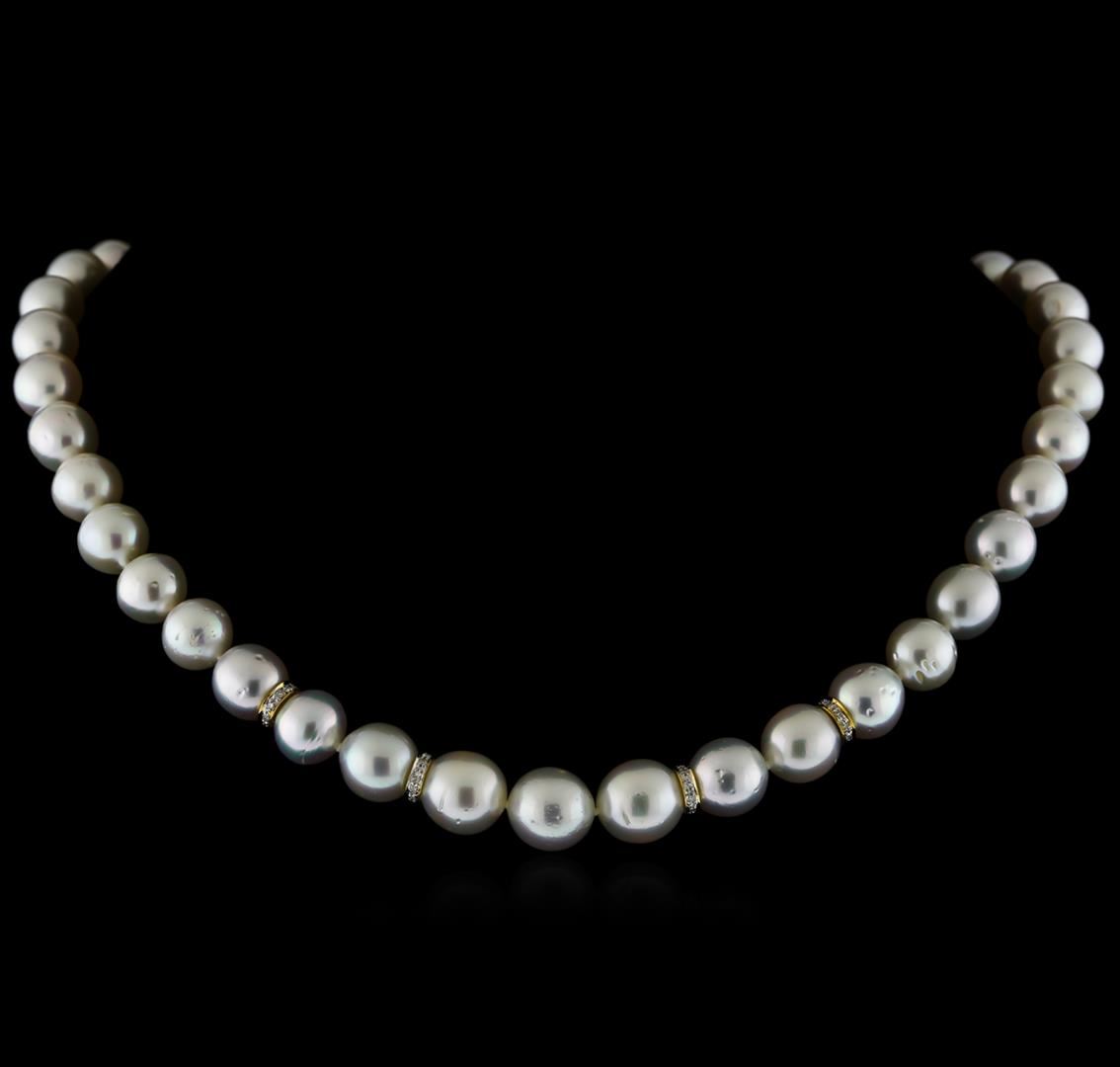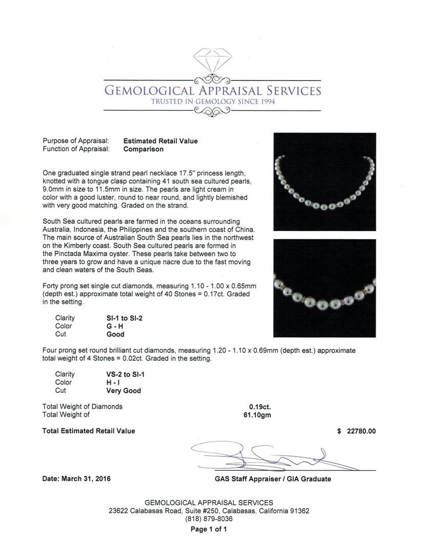 One graduated single strand pearl necklace 17.5" princess length, knotted with a tongue clasp containing 41 south sea cultured pearls, 9.0mm in size to 11.5mm in size. The pearls are light cream in color with a good luster, round to near round, and lightly blemished with very good matching. Graded on the strand. South Sea cultured pearls are farmed in the oceans surrounding Australia, Indonesia, the Philippines and the southern coast of China. The main source of Australian South Sea pearls lies in the northwest on the Kimberly coast. South Sea cultured pearls are formed in the Pinctada Maxima oyster. These pearls take between two to three years to grow and have a unique nacre due to the fast moving and clean waters of the South Seas. Forty prong set single cut diamonds, measuring 1.10 - 1.00 x 0.65mm (depth est.) approximate total weight of 40 Stones = 0.17ct. Graded in the setting. Clarity: SI-1 to SI-2. Color: G - Good Four prong set round brilliant cut diamonds, measuring 1.20 - 1.10 x 0.69mm (depth est.) approximate total weight of 4 Stones = 0.02ct. Graded in the setting. Clarity: VS-2 to SI-1. Color: H - I. Cut Very Good. Total Weight of Diamonds 0.19ct. Total Weight of 61.10gm GAS Appraised at $22,780.00.