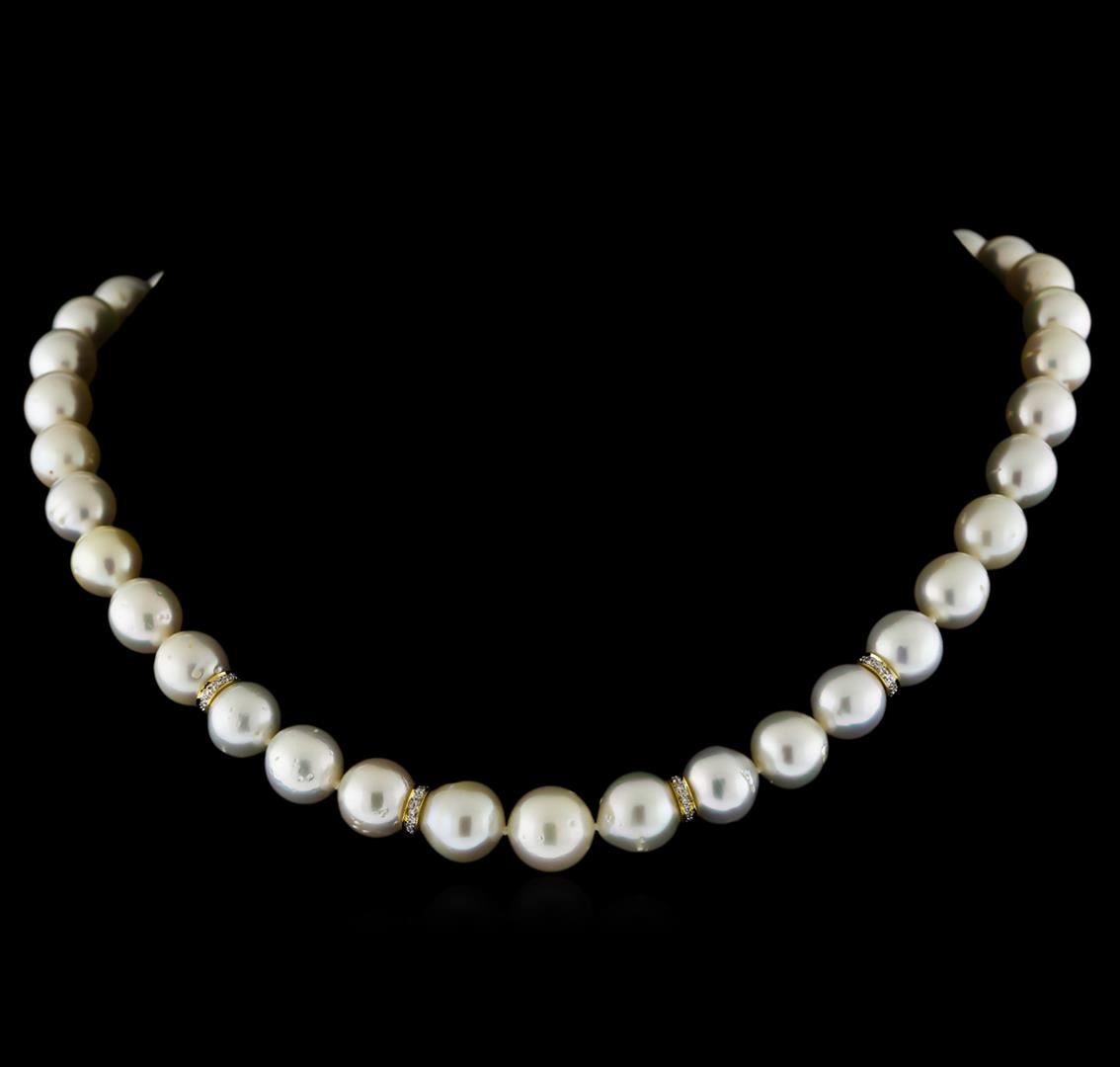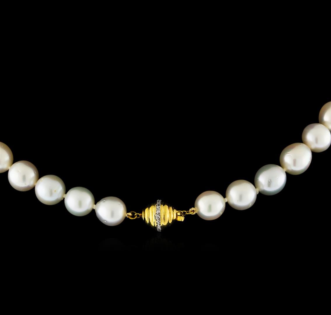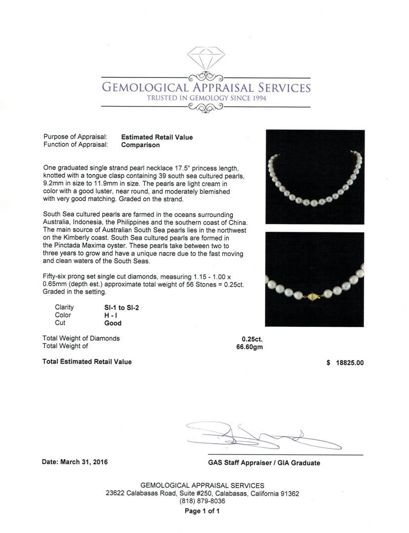 One graduated single strand pearl necklace 17.5" princess length, knotted with a tongue clasp containing 39 south sea cultured pearls, 9.2mm in size to 11.9mm in size. The pearls are light cream in color with a good luster, near round, and moderately blemished with very good matching. Graded on the strand. South Sea cultured pearls are farmed in the oceans surrounding Australia, Indonesia, the Philippines and the southern coast of China. The main source of Australian South Sea pearls lies in the northwest on the Kimberly coast. South Sea cultured pearls are formed in the Pinctada Maxima oyster. These pearls take between two to three years to grow and have a unique nacre due to the fast moving and clean waters of the South Seas. Fifty-Six prong set single cut diamonds, measuring 1.15 - 1.00 x 0.65mm (depth est.) approximate total weight of 56 Stones = 0.25ct. Graded in the setting. Clarity: SI-1 to SI-2. Color: H - I. Cut Good. Total Weight of Diamonds 0.25ct. Total Weight of 66.60gm GAS Appraised at $18,825.00.