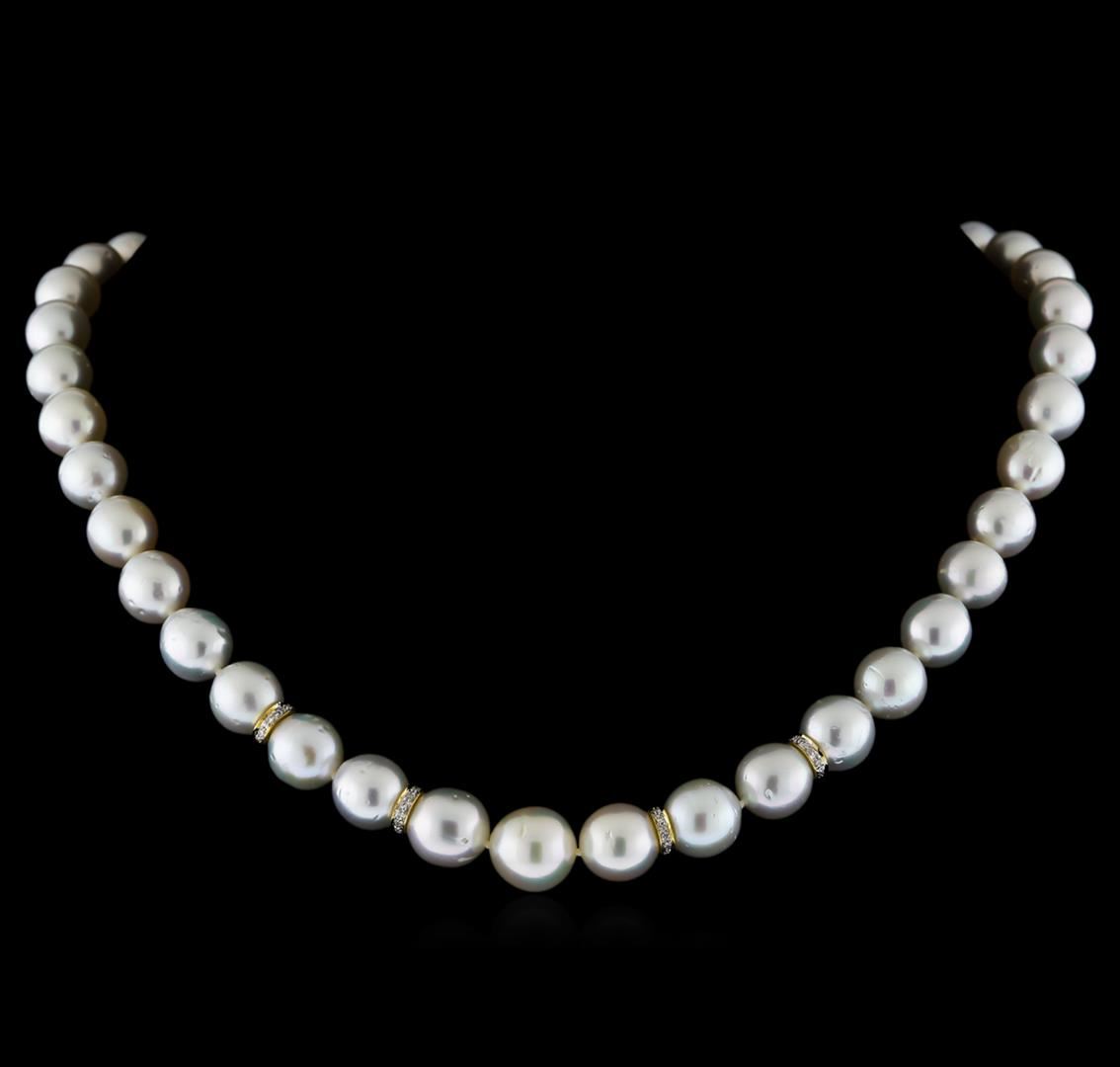 One graduated single strand pearl necklace 18.0" princess length, knotted with a tongue clasp containing 41 south sea cultured pearls, 9.0mm in size to 11.8mm in size. The pearls are light cream in color with a good luster, round to near round, and moderately blemished with very good matching. Graded on the strand. South Sea cultured pearls are farmed in the oceans surrounding Australia, Indonesia, the Philippines and the southern coast of China. The main source of Australian South Sea pearls lies in the northwest on the Kimberly coast. South Sea cultured pearls are formed in the Pinctada Maxima oyster. These pearls take between two to three years to grow and have a unique nacre due to the fast moving and clean waters of the South Seas. Forty prong set single cut diamonds, measuring 1.10 - 1.00 x 0.65mm (depth est.) approximate total weight of 40 Stones = 0.17ct. Graded in the setting. Clarity: SI-1 to SI-2. Color: G - Good Eight prong set round brilliant cut diamonds, measuring 1.20 - 1.10 x 0.71mm (depth est.) approximate total weight of 8 Stones = 0.05ct. Graded in the setting. Clarity: VS-2 to SI-1. Color: H - I. Cut Very Good. Total Weight of Diamonds 0.22ct. Total Weight of 63.00gm GAS Appraised at $20,670.00.