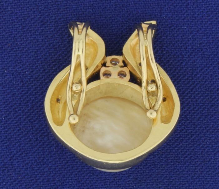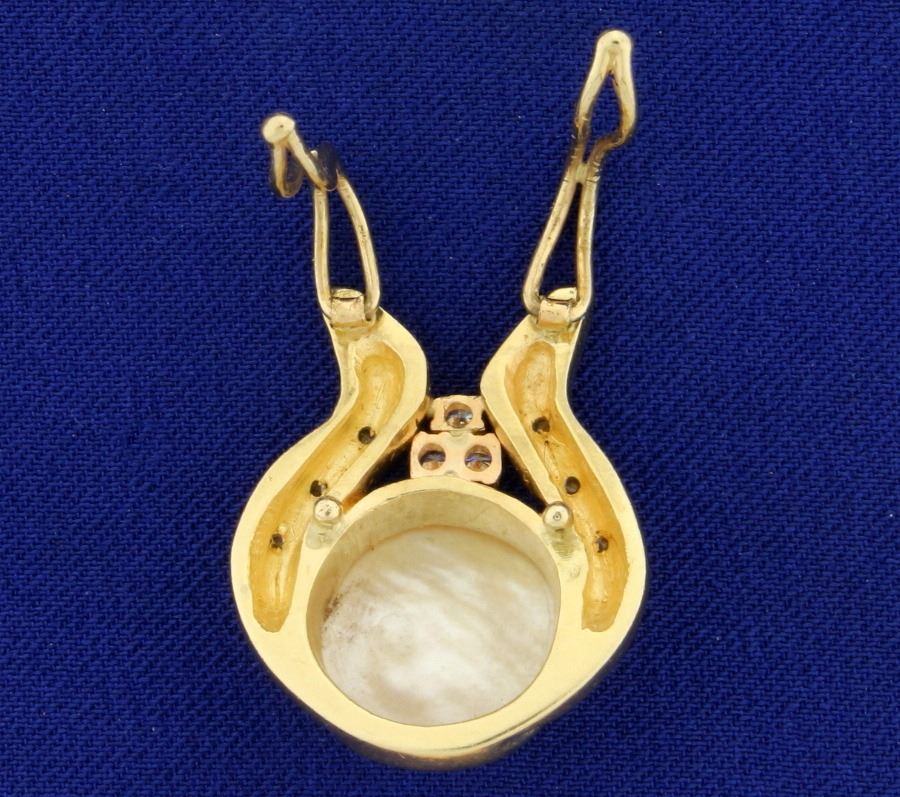 In 14k yellow gold. Contains a 14mm Natural South Sea Pearl with excellent luster and color. Also contains 1/3ct TW of high quality diamonds of VS clarity/F color. 1" long with a back clasp that opens easily to fit on a larger chain or omega. 10.3g.