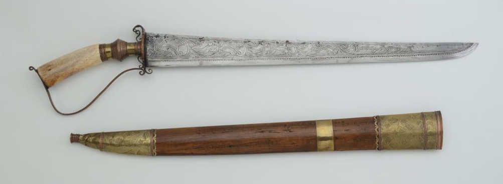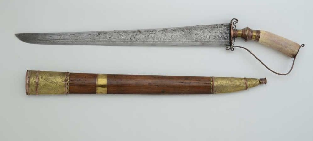 Southeast Asian sword with engraved blade and bone grip, approx. 32” overall and a 24” blade, in very good condition and accompanied by a brass mounted wood sheath. Est.: $300-$600.