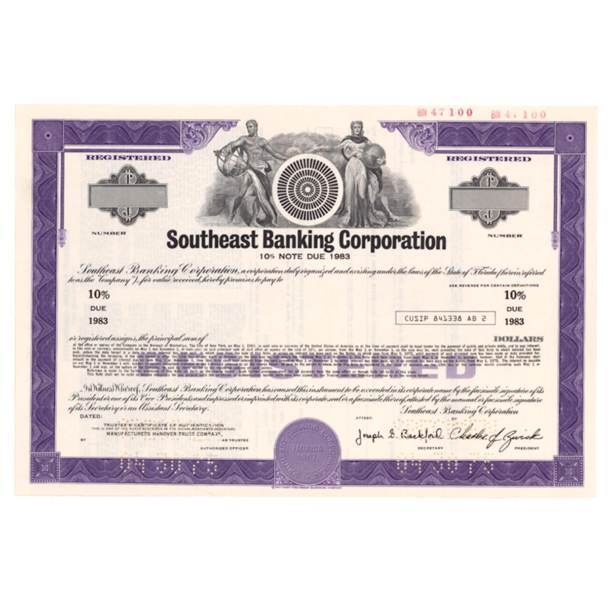 [SPECIMEN] ----, Florida. 10 % note specimen in Southeast Banking Corporation. Vignette of an allegorical male and female at upper center. Perforation cancellation at lower left and right. Very Fine.