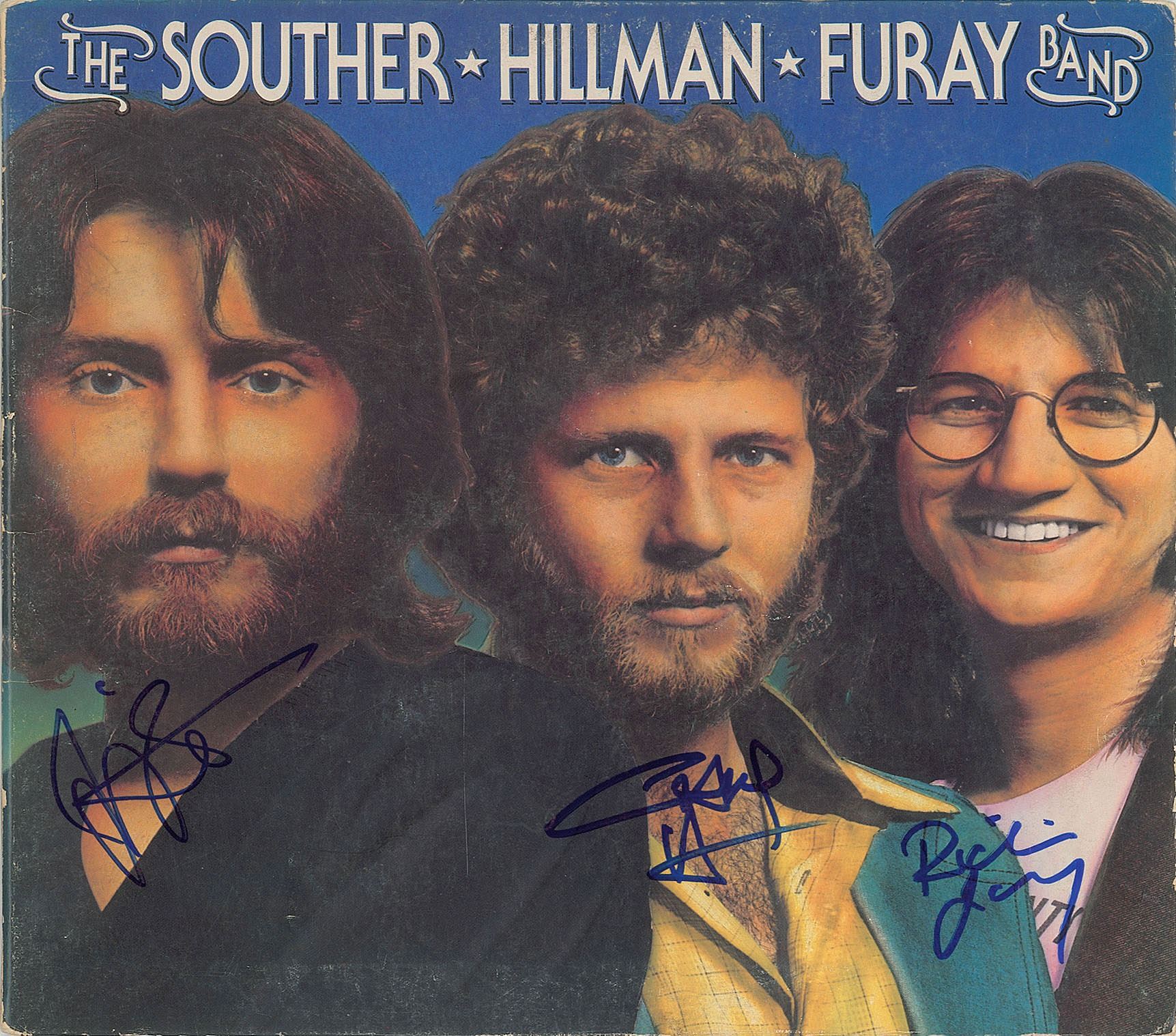 Self-titled debut album from the Souther-Hillman-Furay Band, signed on the front cover in blue felt tip by J. D. Souther, Chris Hillman, and Richie Furay. In fine condition. The record is not included.