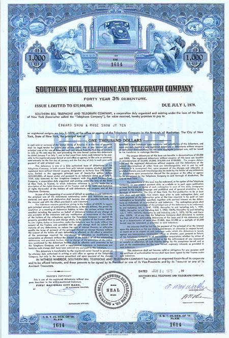 1975. New York. $1000 bond bearing 3%. Blue/White with blue overlay of bell at center. Vignette at top of telehone flanked by two seated allegorical figures. Perferation cancelled. Excellent.