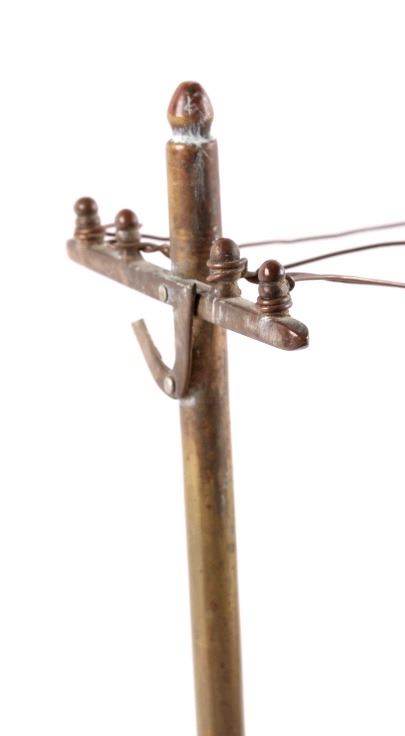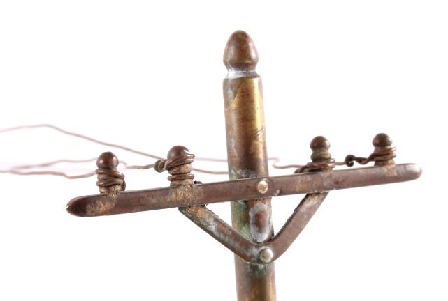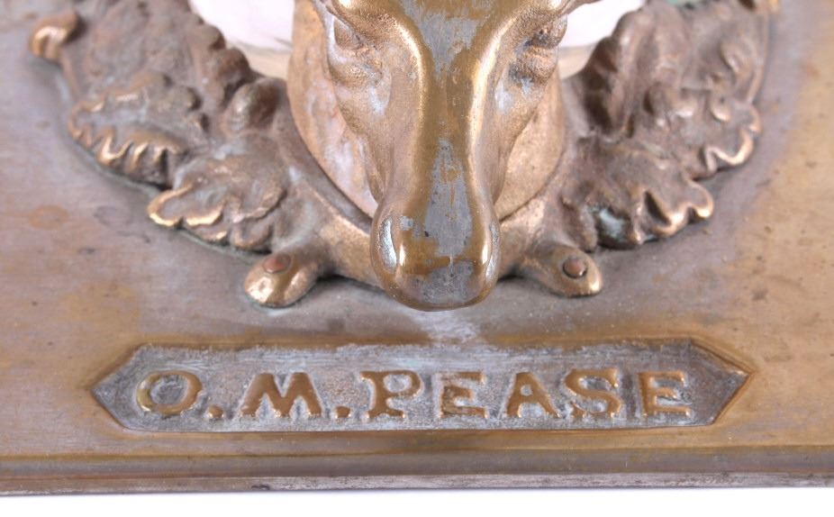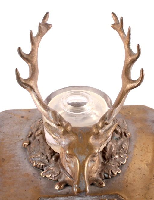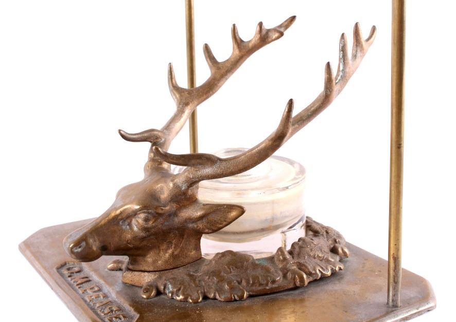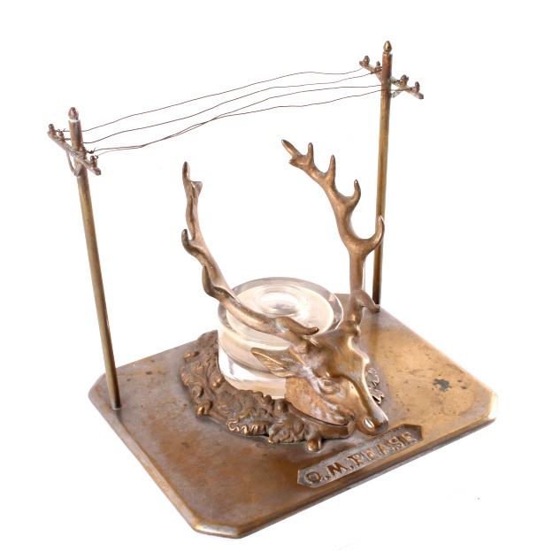 This is an antique inkwell that once belonged to a Southern Bell Telephone. Mr. O.M. Pease was the district plant chief for the telephone company in the early 1900's. The inkwell is made from bronze and has two telephone poles and an elk. It shows good overall condition. The piece measures 8.25" x 6.5" and is 7.75" tall.