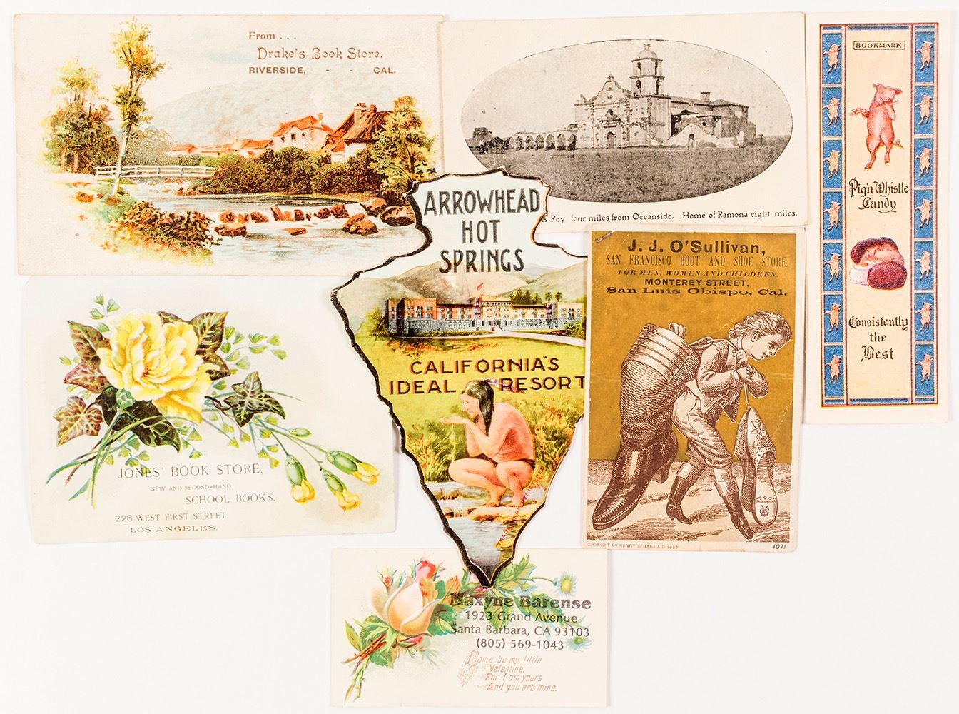 7 Southern CA trade cards from Riverside, Arrowhead, Oceanside, Santa Barbara, San Luis Obispo and Los Angeles. Date: Location: California HWAC # 54137