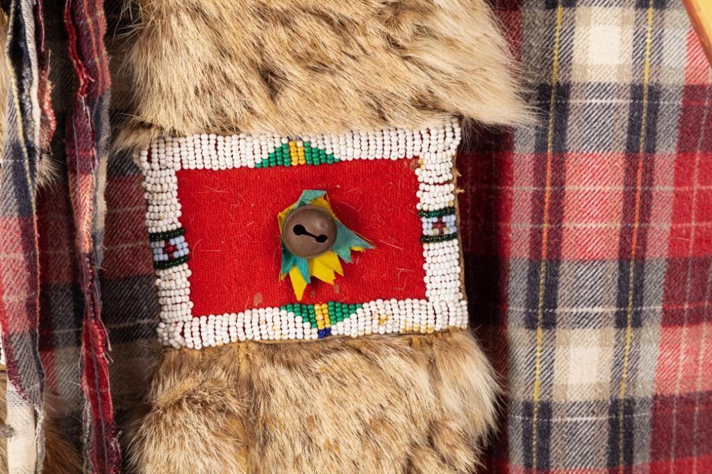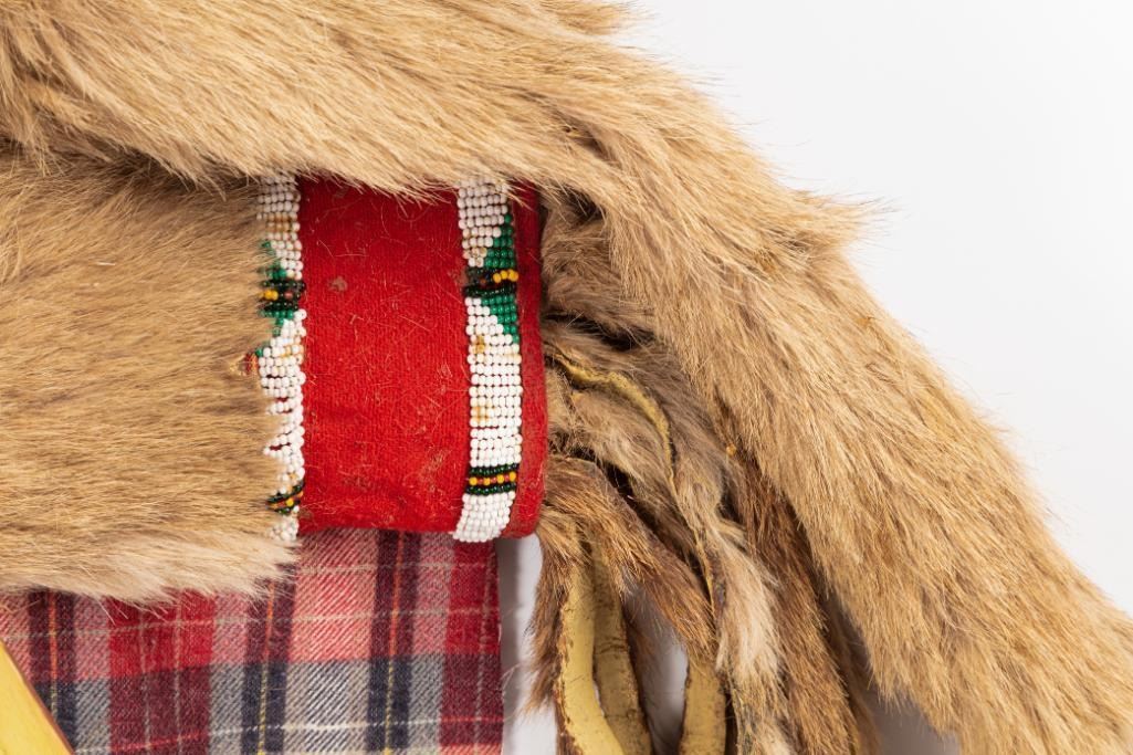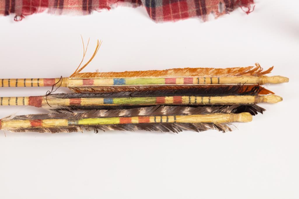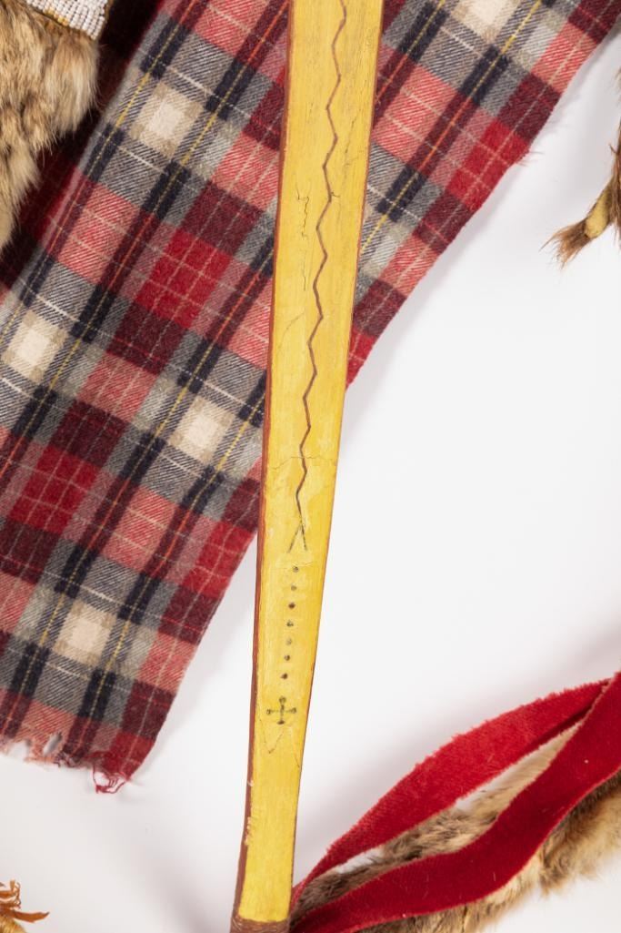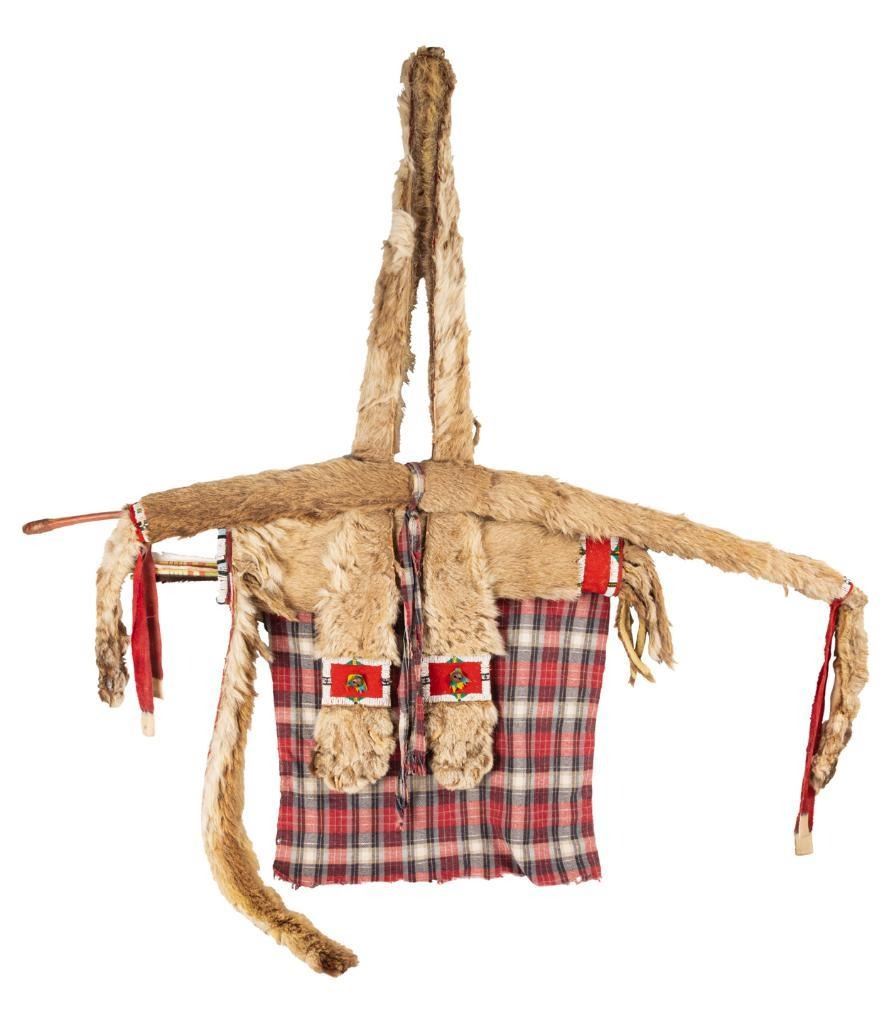 Sinew backed bow with three matching arrows in a beaded quiver and bow case. Brain-tanned cougar skin, sewn with animal sinew and linen thread. Bow is 46" overall, 56" from top to bottom of drop when hanging. Decorated with red wool, Venetian glass seed beads, brass hawk bells, blue and yellow silk ribbons and a cotton cloth panel torn from a shirt back. Also adorned with all four mountain cougar paws. Multiple work periods.