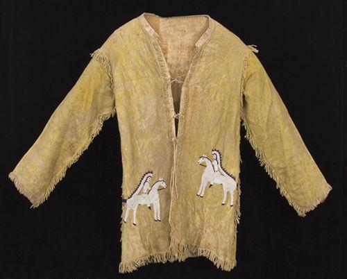 Southern Cheyenne Man’s Coat. Fabulous pictorial beaded decorations on yellow ochred Indian tanned hide. 32" long. Note upside down beaded flags indicating protest at being placed on a reservation. c. 1880s. Fine condition. (est $20,000-30,000).