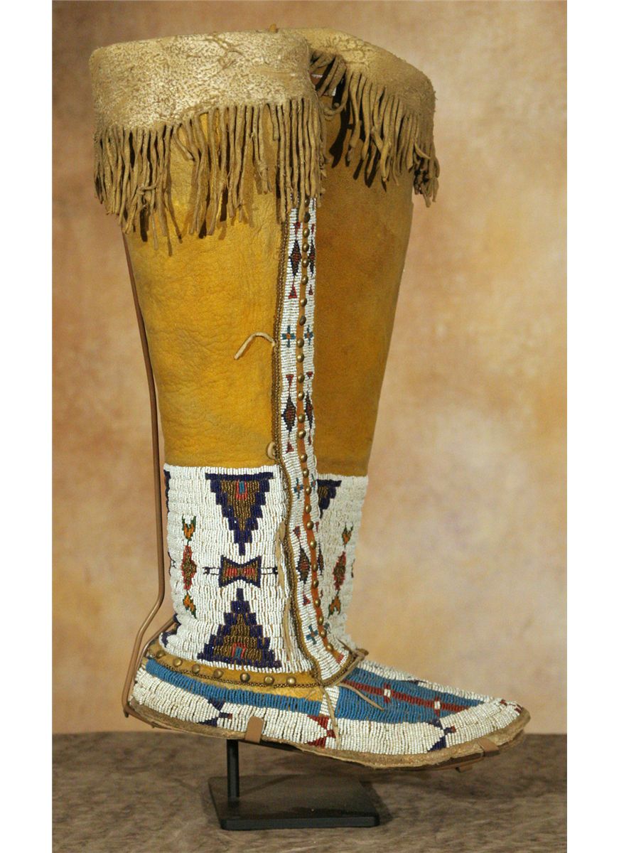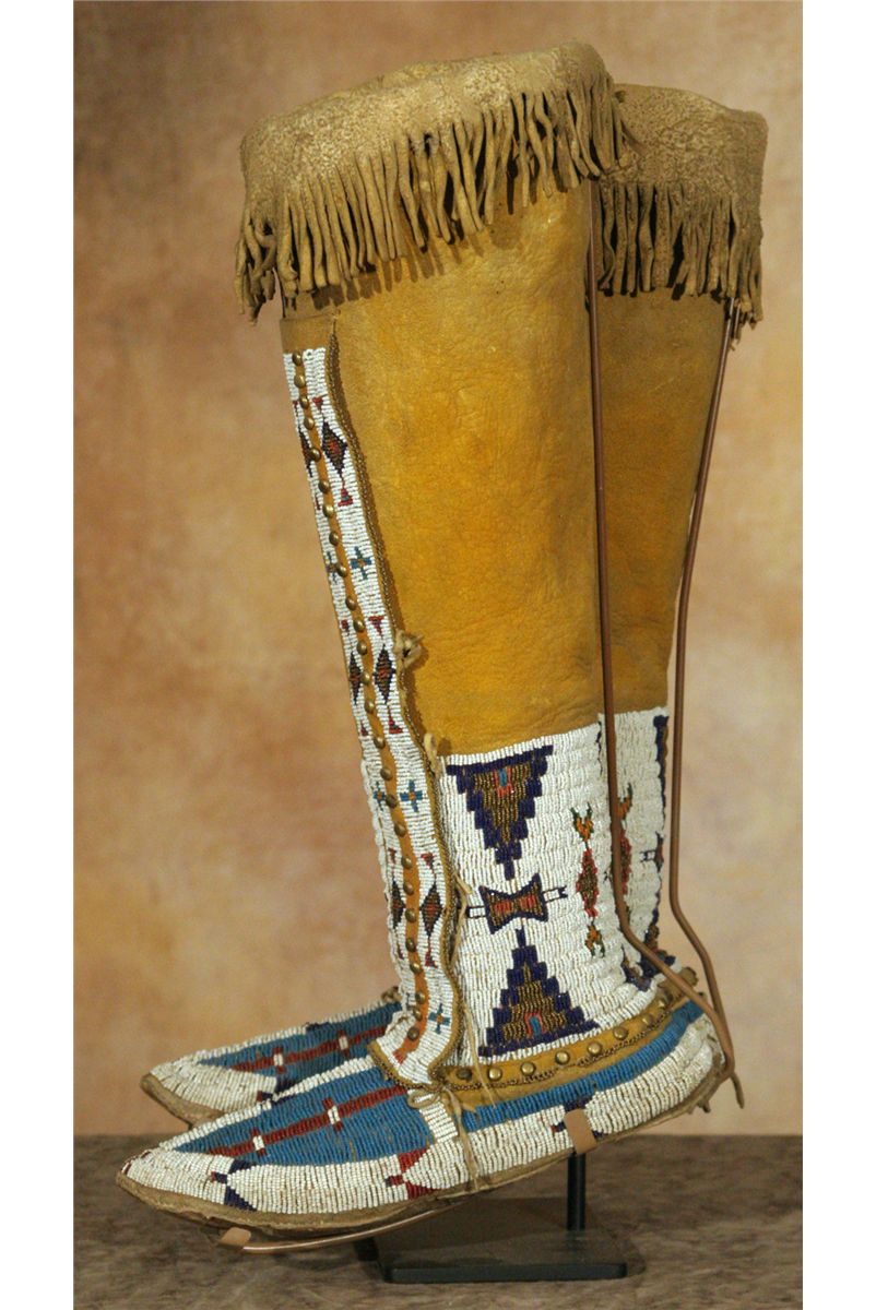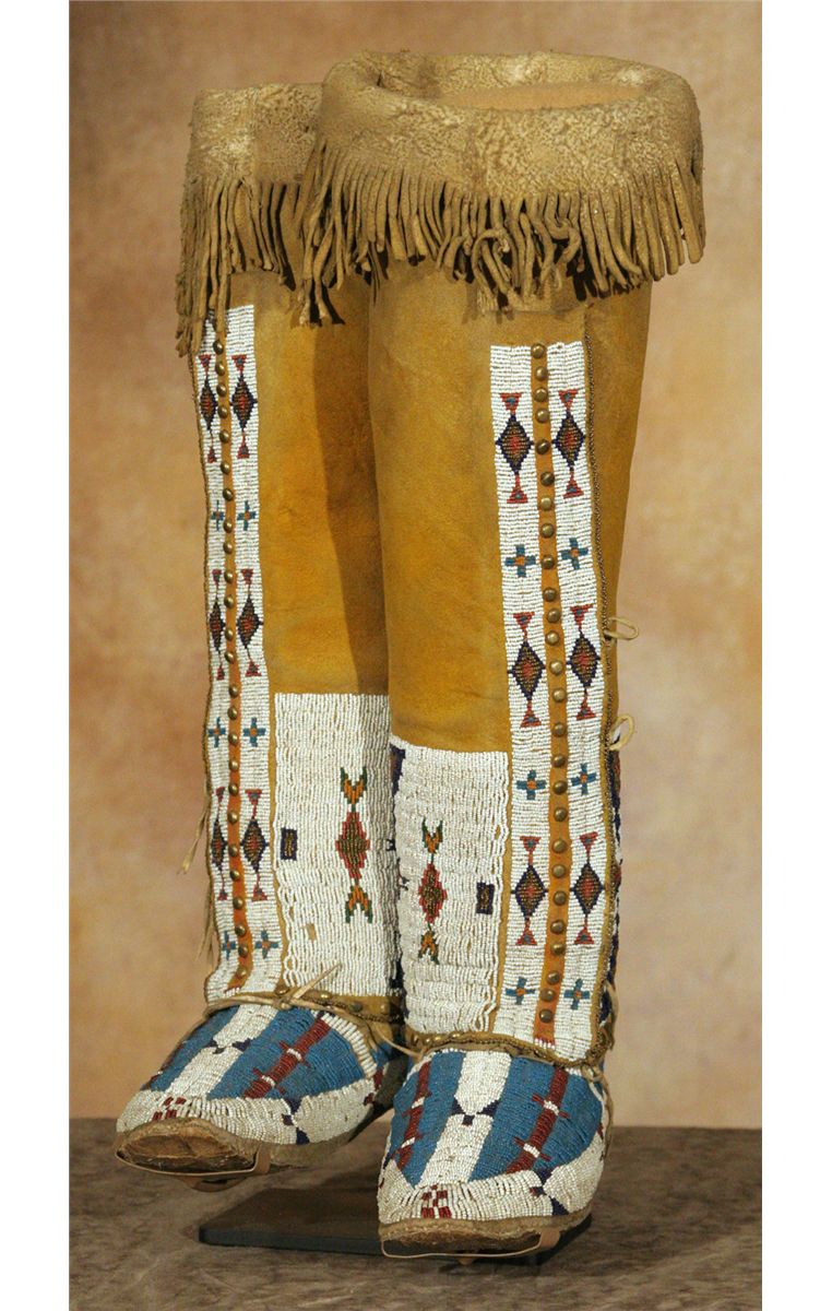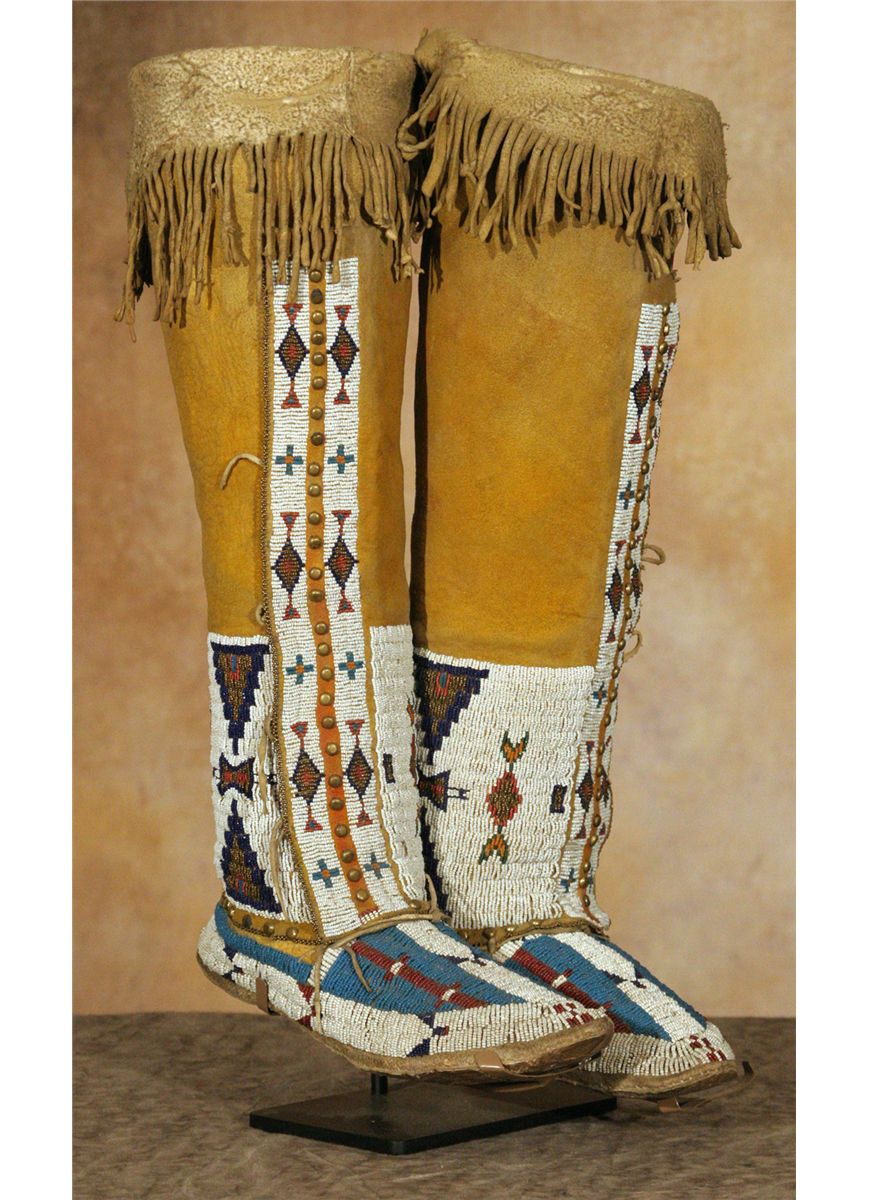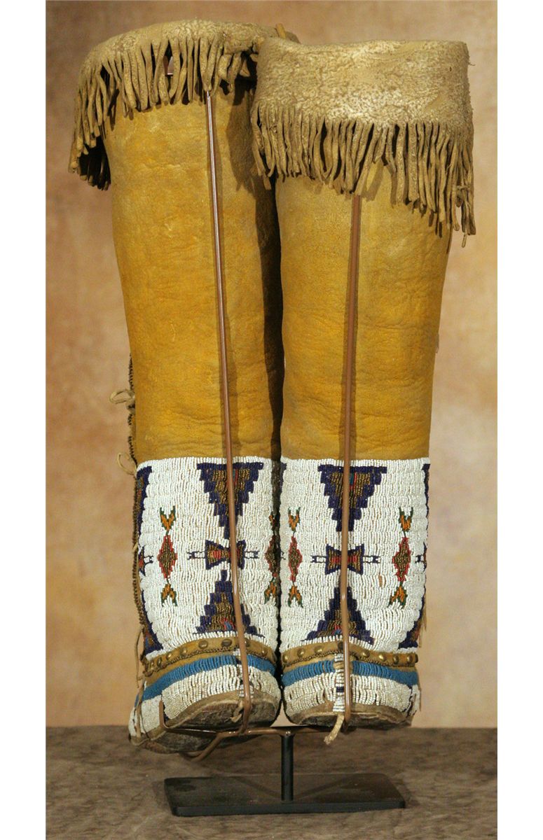 Southern Cheyenne Moccasins and Leggings. 10" sole, 17" tall. Heavily beaded in geometric designs. Hide displays yellow and red pigment. Adorned with brass tacks. Leggings are trimmed delicately in metal net-beading. Nicely fringed. 19th century. Provenance and literature: Collection of Dr. Delwin and Karen Bokelman, PA., and pictured in their book Precious Dreams, pages 6, 13 and 14.