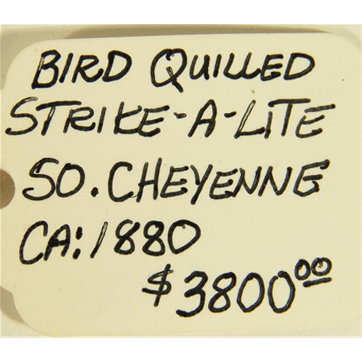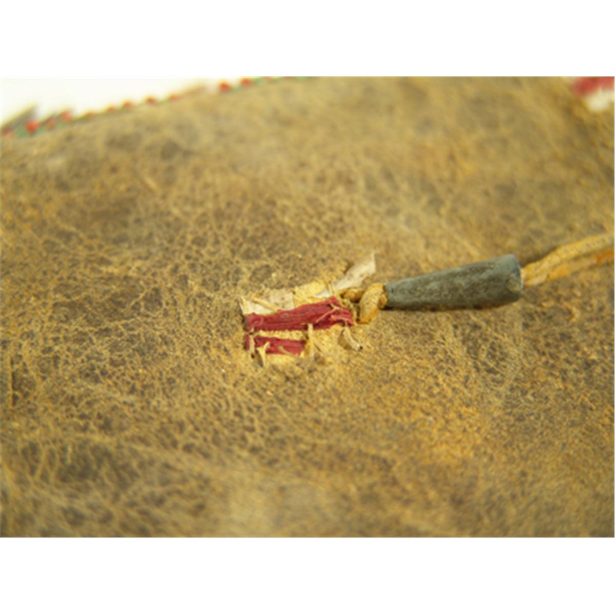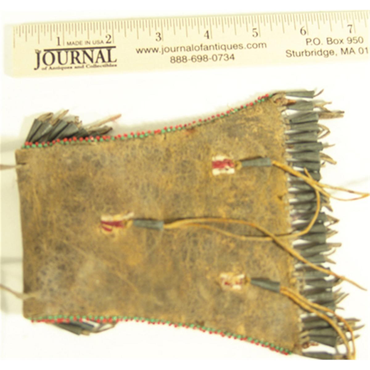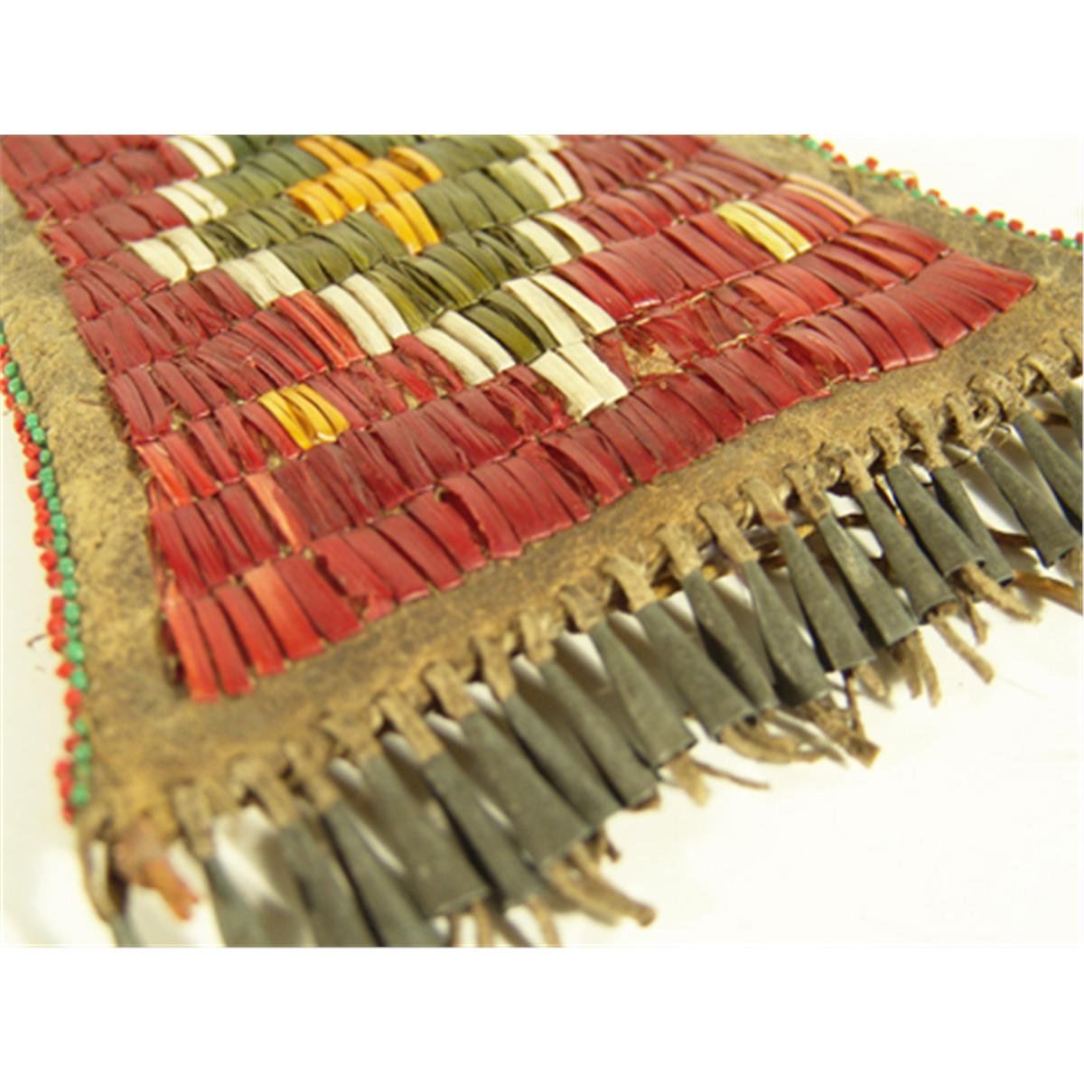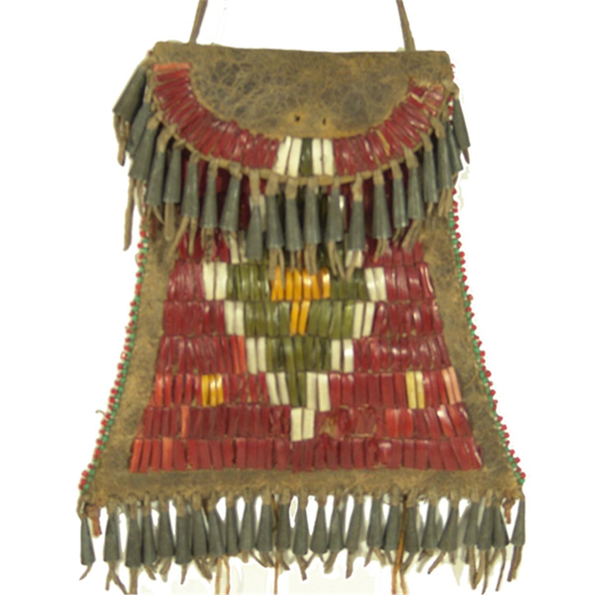 Rare, early, flared hide bag with bird quill design sinew sewn on front with bead trim and tin cone suspensions. Condition: very good, a few missing quills. 5-3/4" x 5"