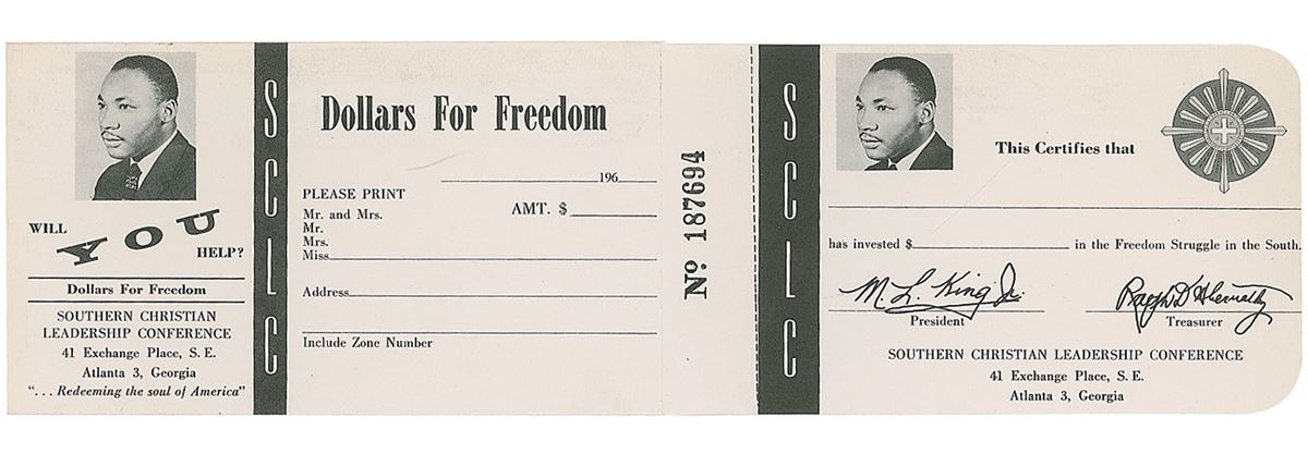 Two items: a folding brochure entitled ‘This Is SCLC,’ eight pages, 4 x 8.5, no date, describing the history and mission of the organization; and an unused ‘Dollars for Freedom’ fundraising envelope depicting Martin Luther King, Jr., with an attached contribution certificate. In overall fine condition. From the collection of Warren Arthur ‘Chip’ Logan.