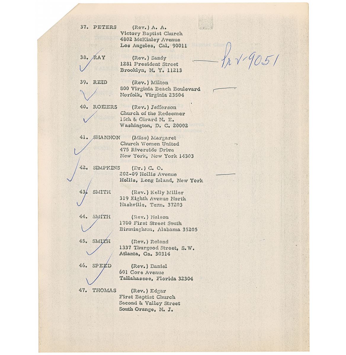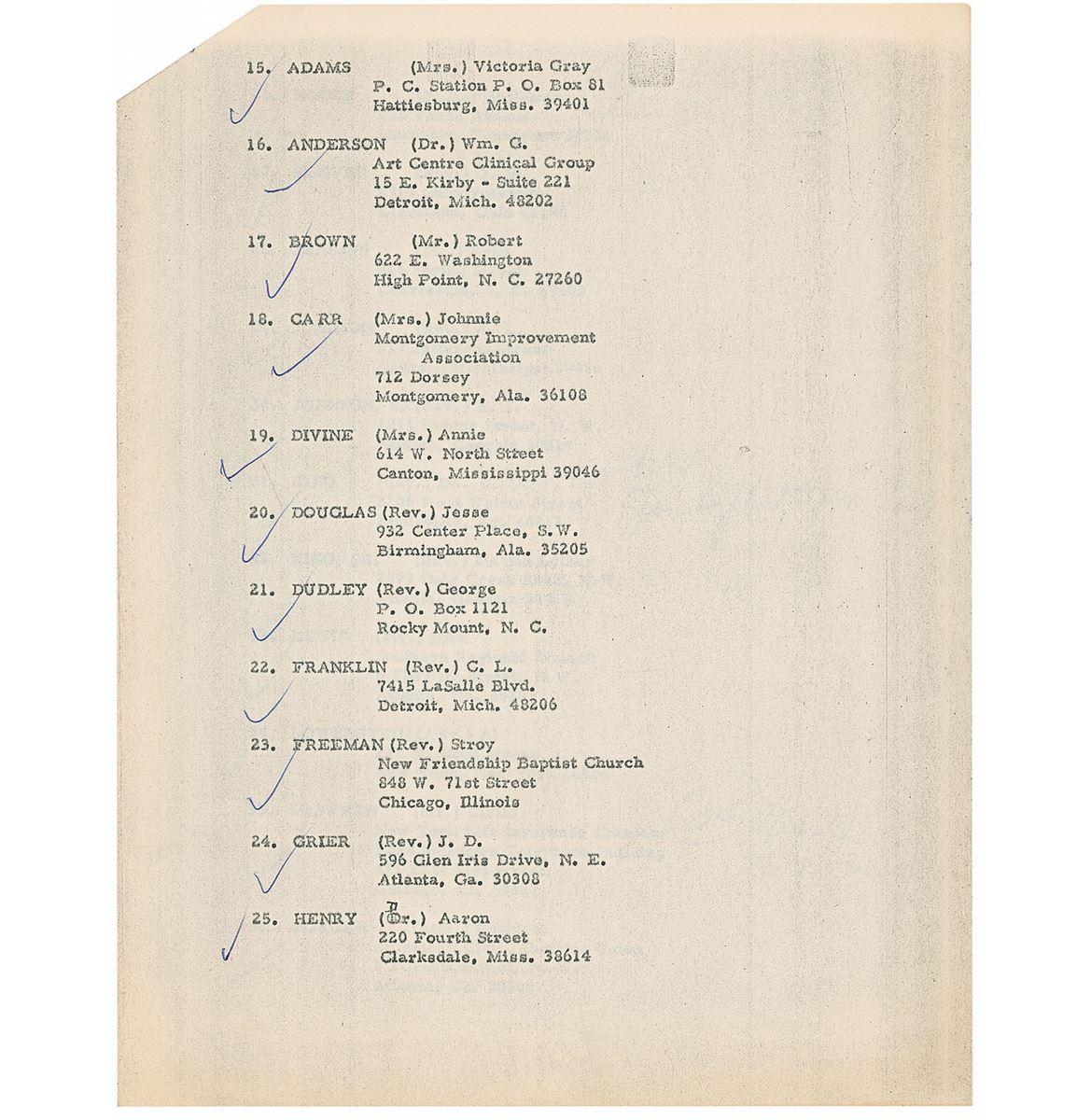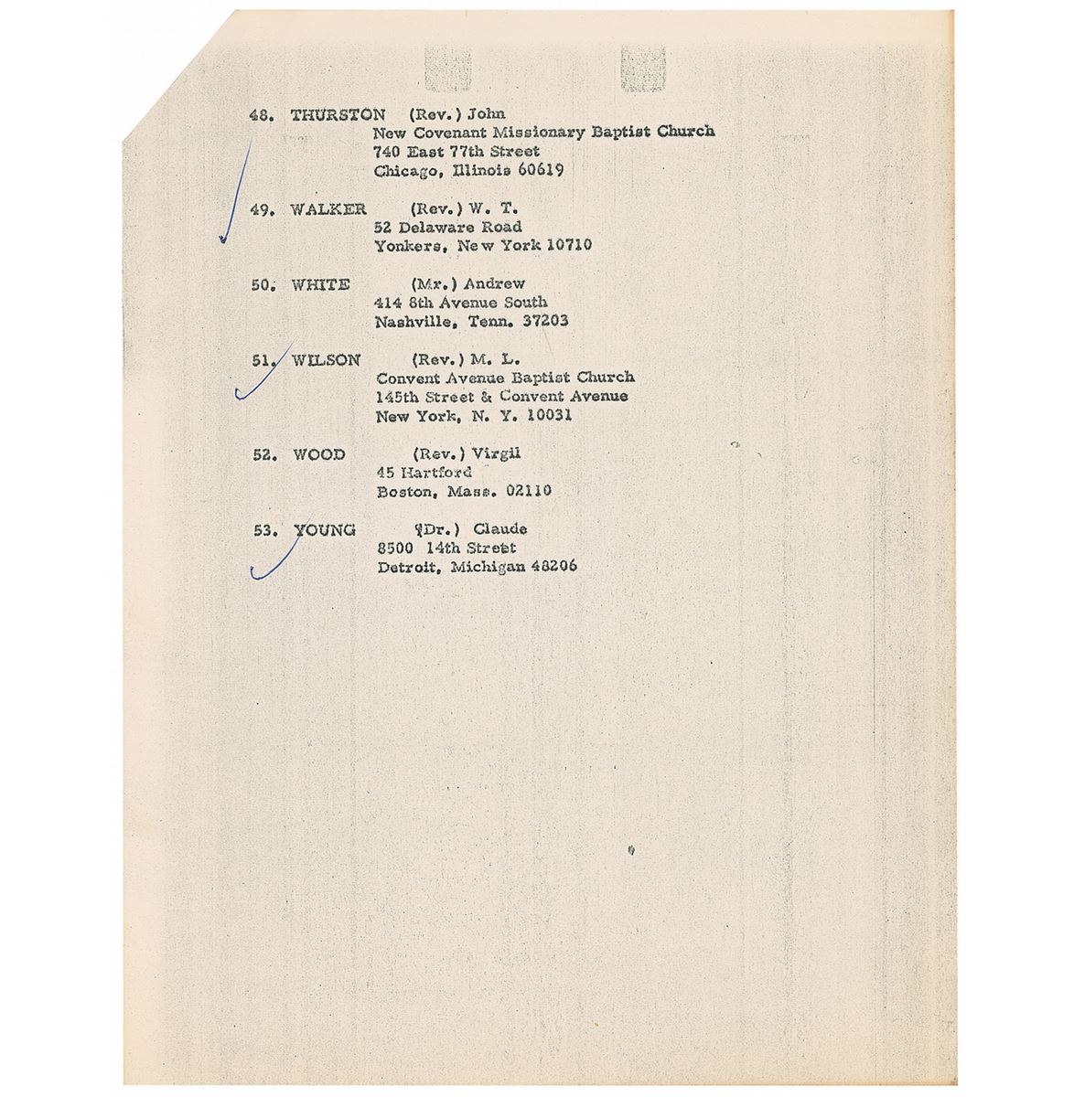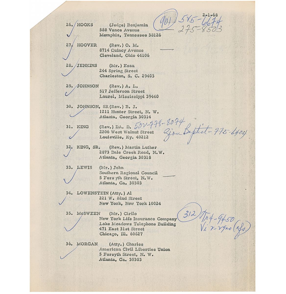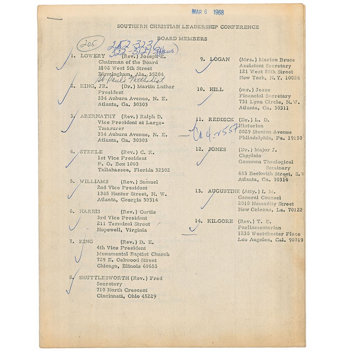 Mimeographed document listing the addresses of board members of the SCLC, five pages, 8.5 x 11, stamp-dated March 6, 1968. Among those listed are Martin Luther King, Jr., Ralph D. Abernathy, Marian Bruce Logan, and John Lewis. The document bears several ballpoint notations and corrections. In fine condition, with overall toning. From the collection of Warren Arthur ‘Chip’ Logan.