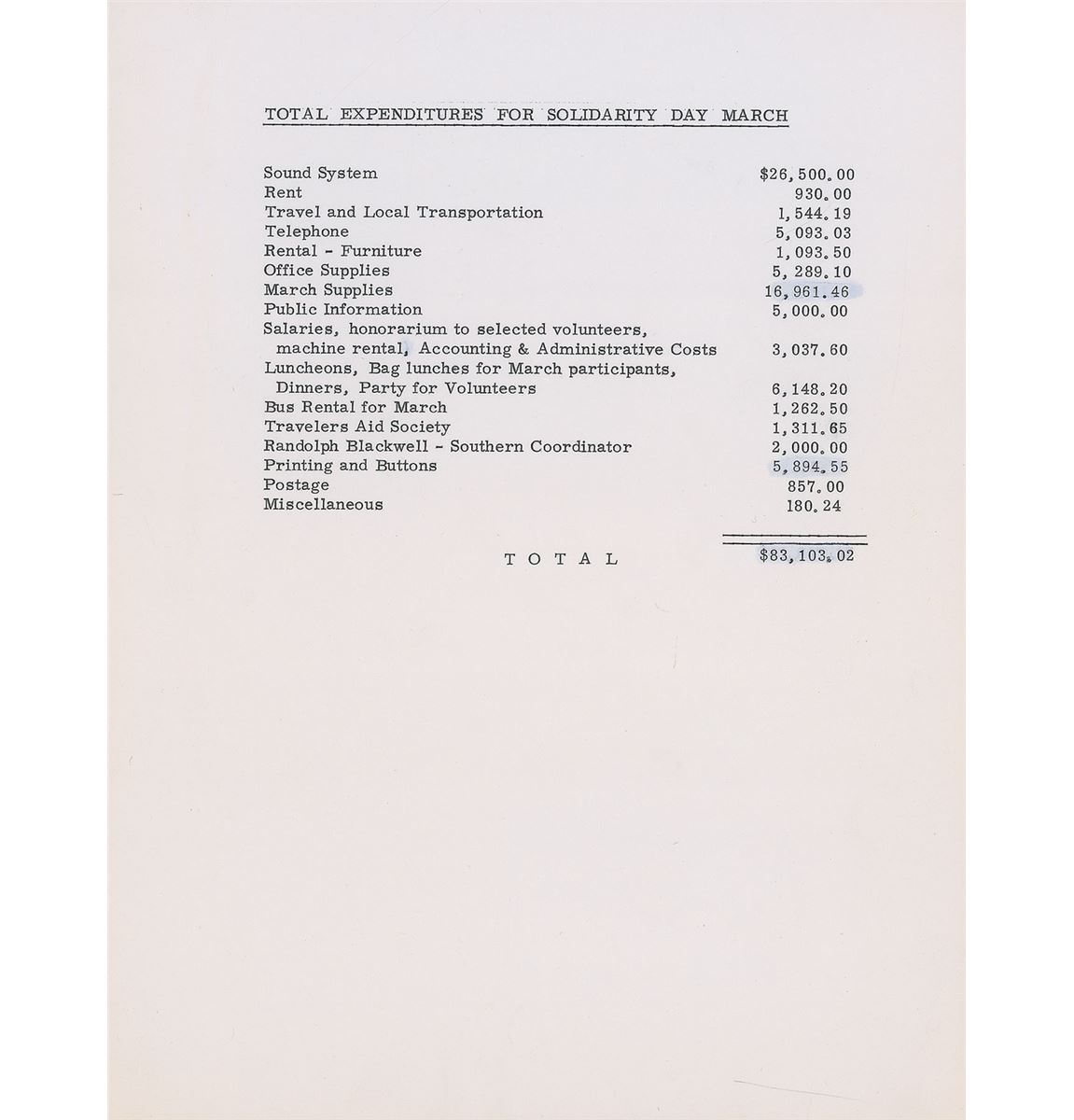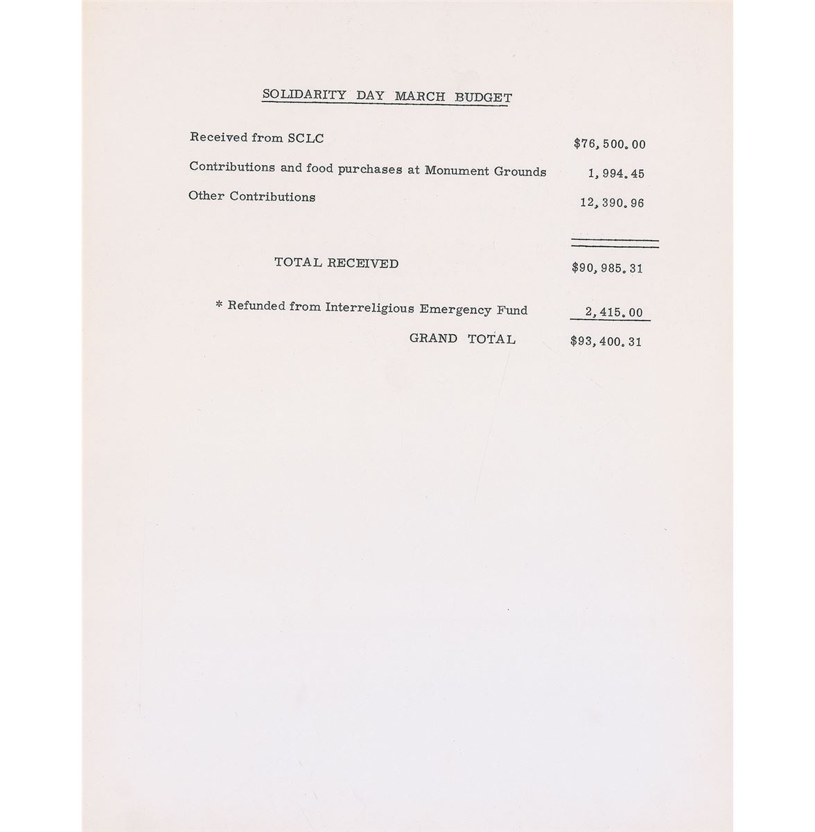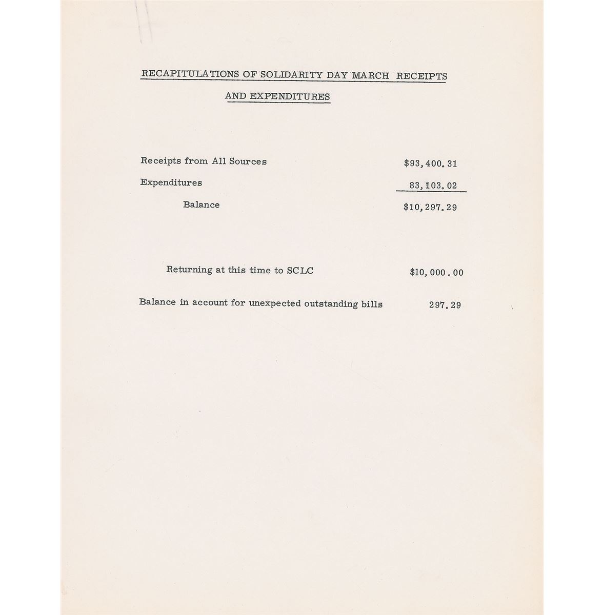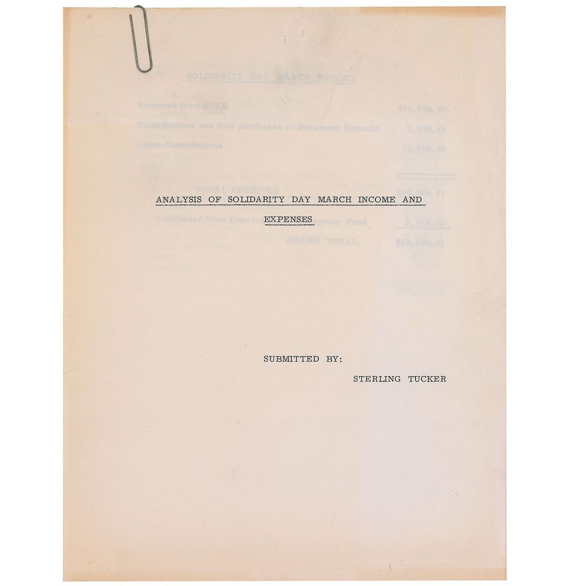 Printed financial report with a cover sheet reading “Analysis of Solidarity Day March Income and Expenses,” three pages, 8.5 x 11, no date but circa June 1968. A report submitted by Sterling Tucker containing a budget and itemized expenditures resulting in a $10,297.29 balance, $10,000 of which was returned to the SCLC. In fine condition, with expected document wear and toning to the cover sheet. From the collection of Warren Arthur ‘Chip’ Logan.
