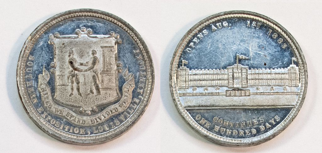 Obv.: Southern Exposition Louisville Kentucky / United We Stand Divided We Fall; rev.: Opens August 1st 1883 / Continues / One Hundred Days.34mm, white metal, brilliant uncirculated with a carbon spot or two.