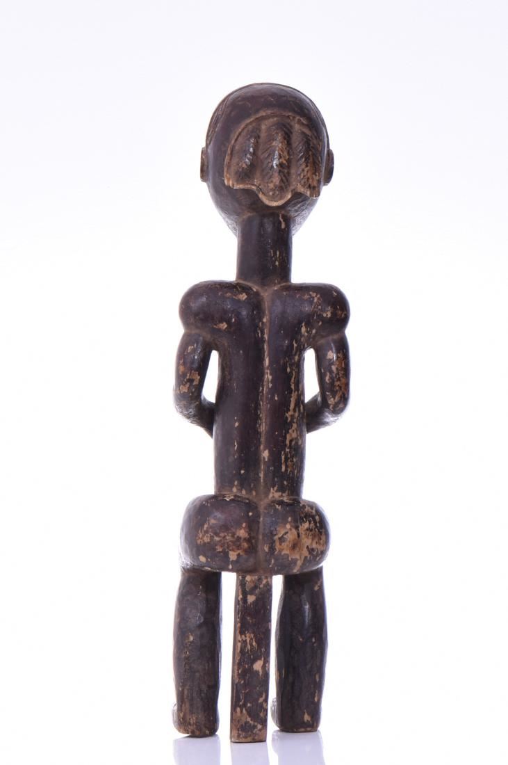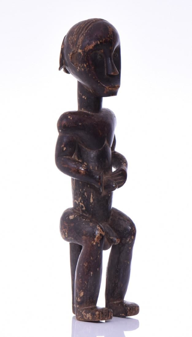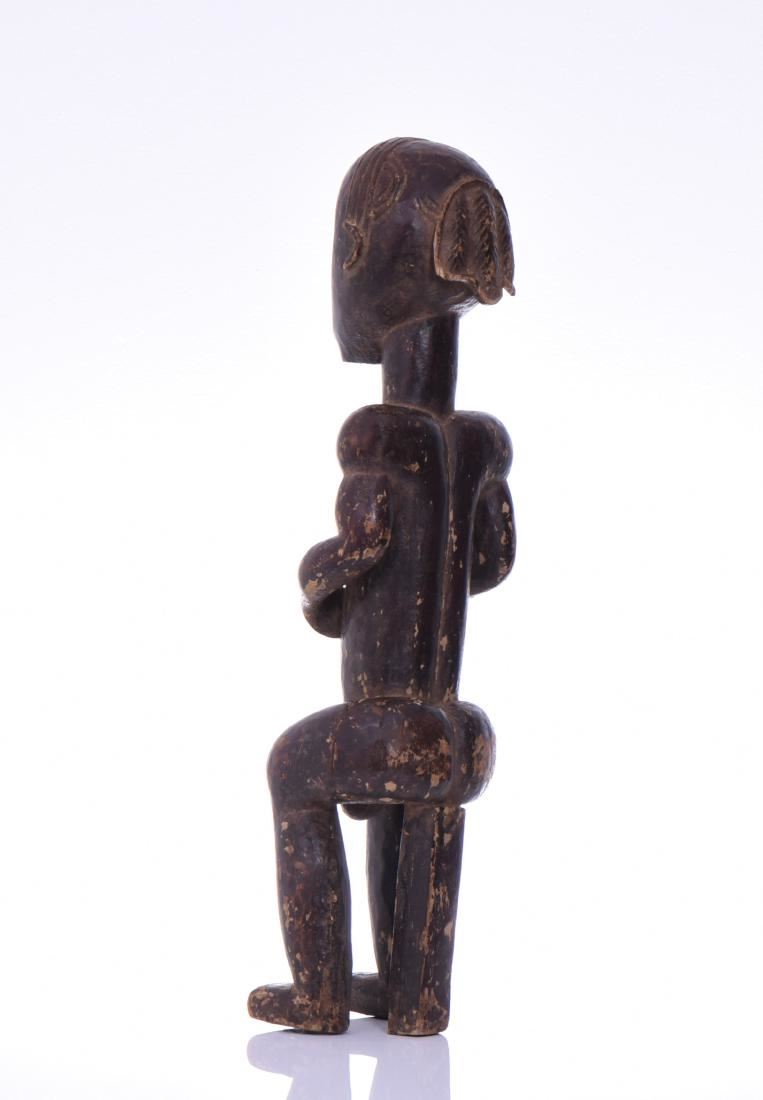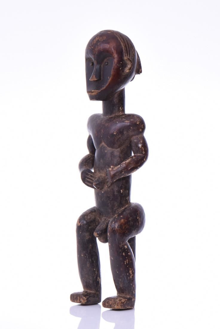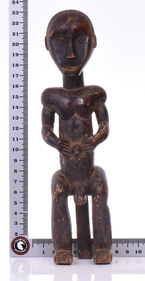 Southern Fang Male Reliquary Guardian Power Figure, African Wood Carving. Estimated more than 100 yrs old. African art is a term typically used for the art of Sub-Saharan Africa. A few of the most popular traditional African art was produced by the tribal people of the Fang, Dan, Baoule, Dogon, Senoufo, Makonde, Bambara, and San. Most African sculpture was historically in wood and other natural materials that have not survived from earlier than a few centuries ago; older pottery figures can be found from a number of areas. Masks are important elements in the art of many peoples, along with human figures, often highly stylized and in vast variety of styles. Sculpture is most common among "groups of settled cultivators in the areas drained by the Niger and Congo rivers. Direct images of deities are relatively infrequent, but masks in particular were made for religious ceremonies. Later West African cultures developed bronze casting for reliefs, like the Benin Bronzes, to decorate palaces and for highly naturalistic royal heads from around the Yoruba town of Ife, in terracotta as well as metal, from the 12th to 14th centuries. Akan gold weights are a form of small metal sculptures produced over the period 1400–1900; some apparently represent proverbs, contributing a narrative element rare in African sculpture; and royal regalia included impressive gold sculptured elements. Many West African figures are used in religious rituals and are often coated with materials placed on them for ceremonial offerings. Eastern Africans, in many areas shorter of large timber to carve, are known for Tinga Tinga paintings and Makonde sculptures. There is also tradition of producing textile art. Modern Zimbabwean sculptors in soapstone have achieved considerable international success. Southern Africa's oldest known clay figures date from 400 to 600 AD and have cylindrical heads with a mixture of human and animal features. (Wikipedia) Size: See Ruler Photo. (Photos Represent The Condition Of The Lot.)