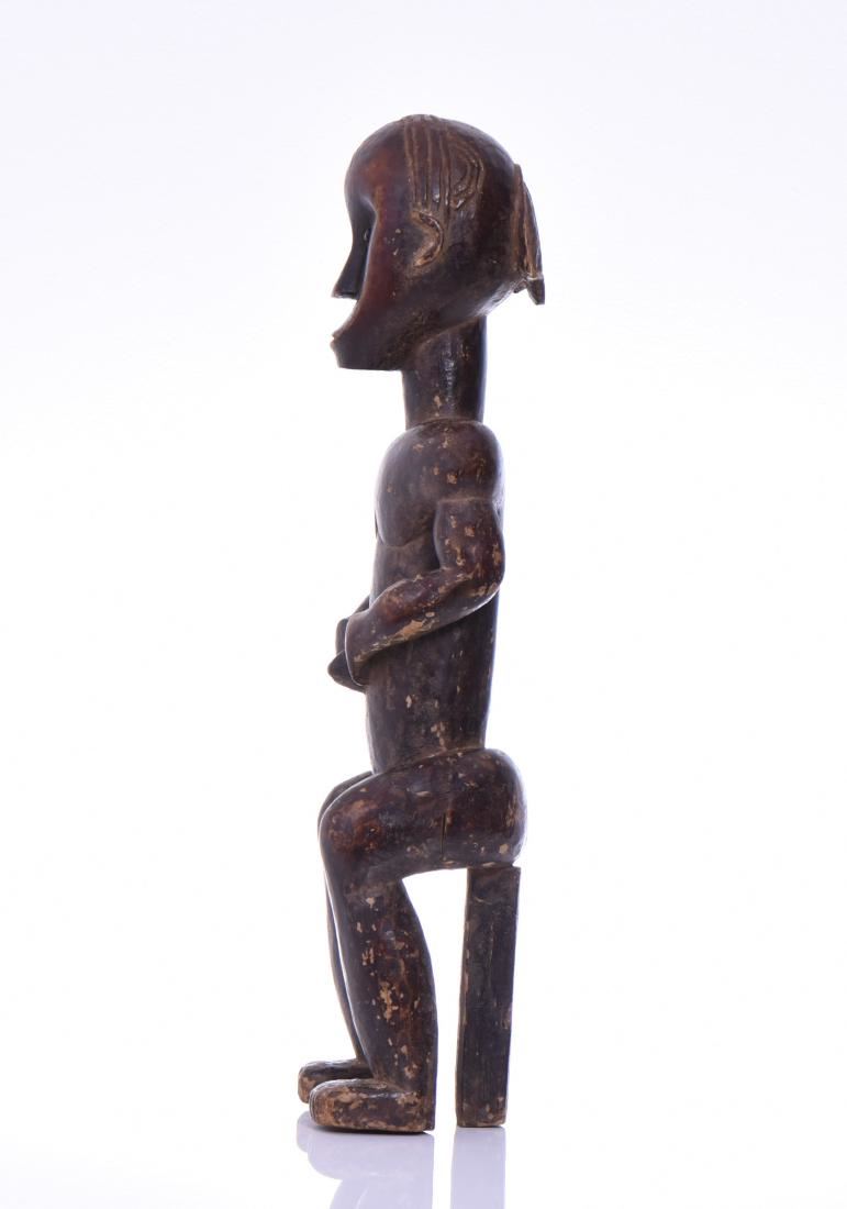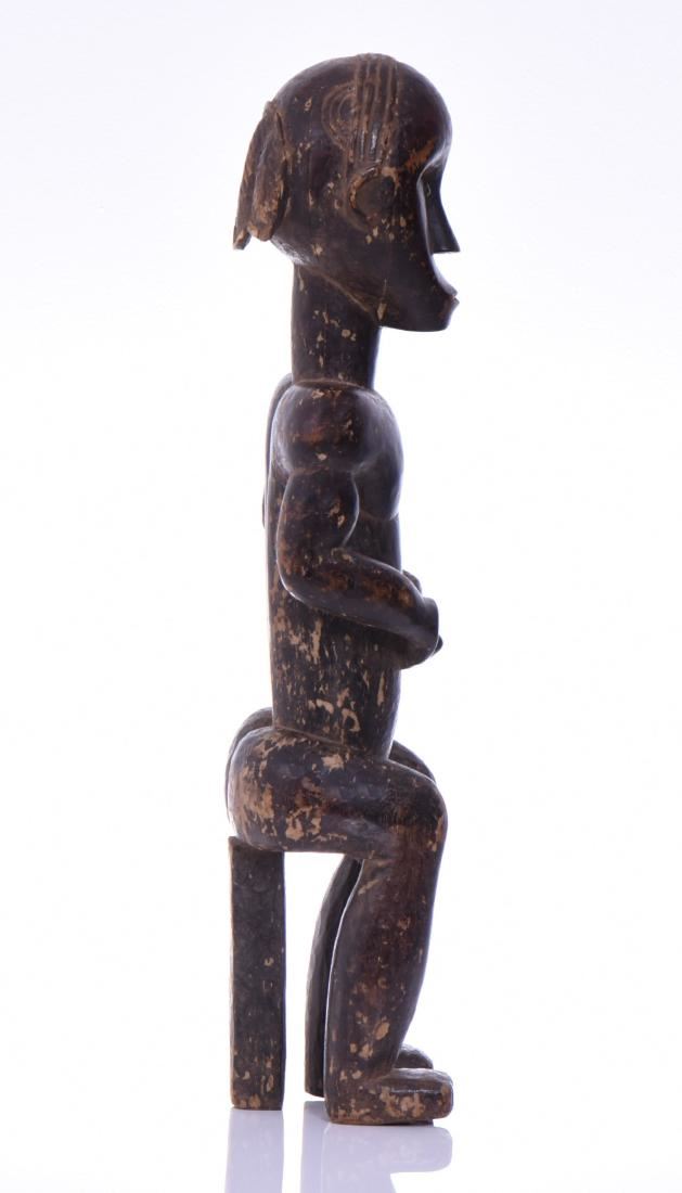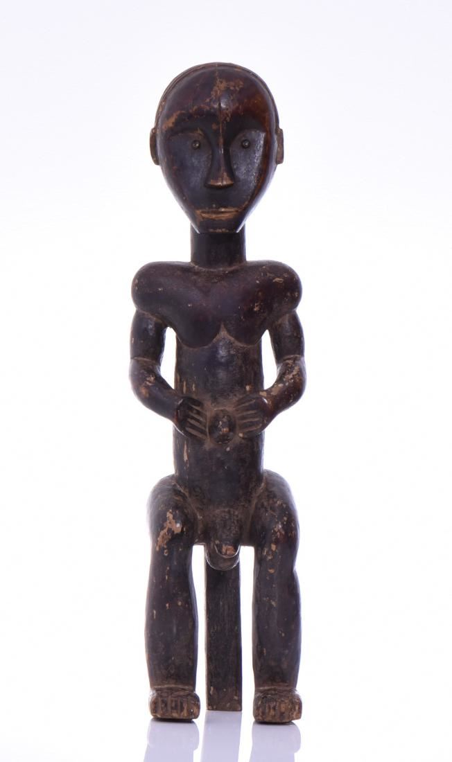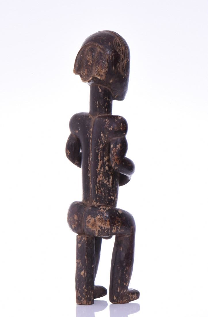 Southern Fang Male Reliquary Guardian Power Figure, African Wood Carving. Estimated more than 100 yrs old. African art is a term typically used for the art of Sub-Saharan Africa. A few of the most popular traditional African art was produced by the tribal people of the Fang, Dan, Baoule, Dogon, Senoufo, Makonde, Bambara, and San. Most African sculpture was historically in wood and other natural materials that have not survived from earlier than a few centuries ago; older pottery figures can be found from a number of areas. Masks are important elements in the art of many peoples, along with human figures, often highly stylized and in vast variety of styles. Sculpture is most common among "groups of settled cultivators in the areas drained by the Niger and Congo rivers. Direct images of deities are relatively infrequent, but masks in particular were made for religious ceremonies. Later West African cultures developed bronze casting for reliefs, like the Benin Bronzes, to decorate palaces and for highly naturalistic royal heads from around the Yoruba town of Ife, in terracotta as well as metal, from the 12th to 14th centuries. Akan gold weights are a form of small metal sculptures produced over the period 1400–1900; some apparently represent proverbs, contributing a narrative element rare in African sculpture; and royal regalia included impressive gold sculptured elements. Many West African figures are used in religious rituals and are often coated with materials placed on them for ceremonial offerings. Eastern Africans, in many areas shorter of large timber to carve, are known for Tinga Tinga paintings and Makonde sculptures. There is also tradition of producing textile art. Modern Zimbabwean sculptors in soapstone have achieved considerable international success. Southern Africa's oldest known clay figures date from 400 to 600 AD and have cylindrical heads with a mixture of human and animal features. (Wikipedia) Size: See Ruler Photo. (Photos Represent The Condition Of The Lot.)