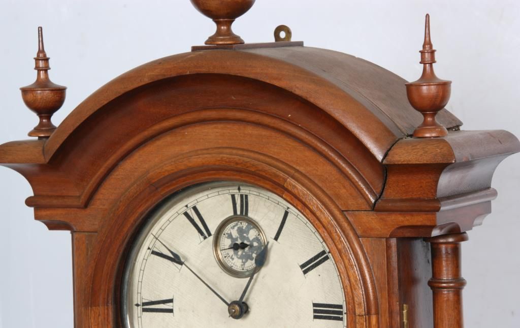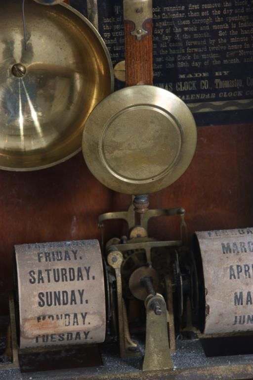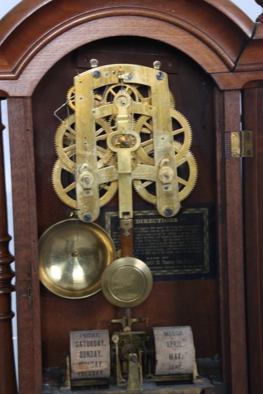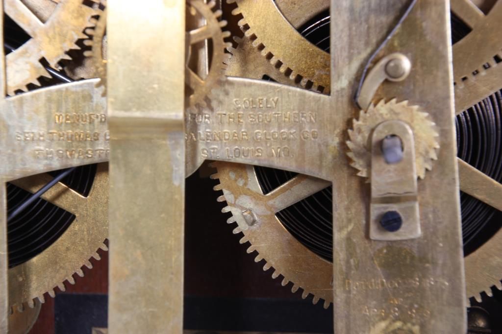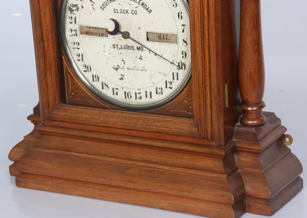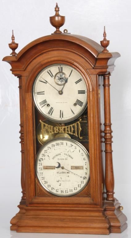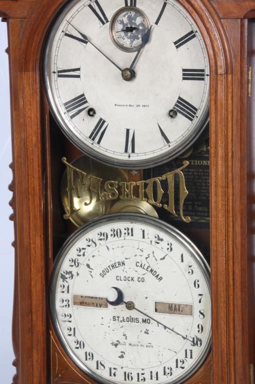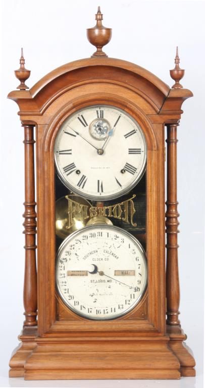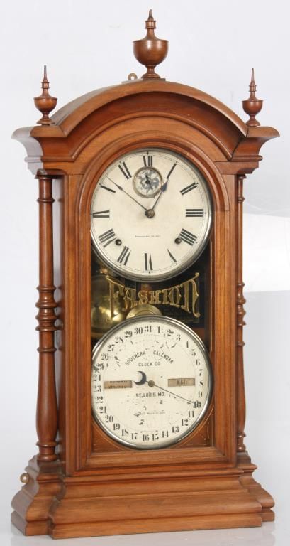 Southern Fashion No. 5 Double Dial Calendar Clock. Original 7.5 in. painted dial, black Roman hour numerals, fancy blued hands, inset paper sub seconds dial with silvered bezel; lower calendar dial signed Southern Calendar Clock Co. St. Louis, Mo., lower dial is set on a hinged door. Good calendar hand. Has a Seth Thomas brass 8 day spring driven movement, manufactured by Seth Thomas Clock Co. for the Southern Calendar Clock Co, deadbeat escapement, brass bell hour strike, short drop pendulum has a wood stick with brass covered bob. Original calendar mechanism is in good running condition, has original paper labels on the brass barrels. Walnut case is original finish, turned columns on the sides, pointed finials on the arched top and gold leaf on the door glass that reads - "Fashion". Clock is all original and in good working condition, dials are warped and have some paint loss, center finial is missing its tip. 32 in. high x 16 in. wide x 6.5 in. deep.