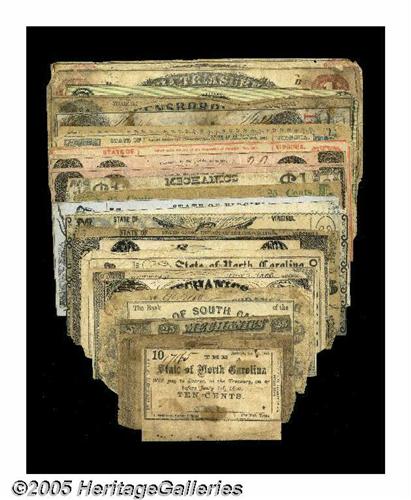 <B>Southern Hospitality.</B></I><BR>Savannah, GA- Mechanics Savings and Loan Association 25¢ 186? VG<BR>Savannah, GA- Mechanics Savings and Loan Association Facsimile 50¢ Oct. 25, 1861 AU<BR>Savannah, GA- Mechanics Savings and Loan Association $1 July 20, 1862 VG<BR>Carlisle, KY- Farming & Commercial Bank $3 Dec. 9, 1809 G22a Hughes 109 Fine<BR>Carlisle, KY- Farming & Commercial Bank $5 Nov. 17, 1819 G24a Hughes 110 VF<BR>Camden, NC- Camden County Facsimile 25¢ Sep. 9, 1861 AU<BR>Greensboro, NC- Greensboro Mutual Life Insurance and Trust Co. $2 1861 AG, once mounted<BR>Raleigh, NC- State of North Carolina 10¢ Oct. 1, 1861 Criswell 57 VG, once mounted<BR>Raleigh, NC- State of North Carolina 75¢ Jan. 1, 1863 Criswell 134 Fine, once mounted<BR>Raleigh, NC- State of North Carolina $1 Oct. 13, 1861 Criswell 32C VG, once mounted<BR>Charleston, SC- Bank of South Carolina $10 Aug. 4, 1859 G46a Sheheen 372 Fine, repairs<BR>Charleston, SC- Bank of the State of South Carolina 15¢ Feb. 1, 1863 G92d Sheheen 496 AU<BR>Nashville, TN- Bank of Tennessee Facsimile 10¢ Dec. 1, 1861 G54b AU<BR>Charlestown, VA- Corporation of Charleston 15¢ Jan. 1, 1862 Jones TC05-17A AU<BR>Madison County, VA- Madison County Facsimile $2 Sep. 2, 1861 Jones CMO1-11A AU<BR>Portsmouth, VA- Portsmouth Insurance Co 25¢ July 16, 1861 Jones PP60-30 AG<BR>Portsmouth, VA- City of Portsmouth 10¢ Oct. 29, 1862 TP10-09 Good<BR>Richmond, VA- Virginia Treasury Note $1 VG July 21, 1862 Criswell 17 Jones VT03-13 Fine<BR>Richmond, VA- Virginia Treasury Note $1 Fine Oct. 21, 1862 Criswell 18 Jones VT03-14 Good-VG<BR>Richmond, VA- C.R. Bricken Facsimile 5¢ Sep. 3, 1861 Jones PR60-081A AU, missing corner tip<BR>Richmond, VA- Corporation of Richmond Facsimile $1 Apr. 19, 1861 Jones TR05-21A XF, with damage <BR>Winchester, VA- Corporation of Winchester Facsimile 5¢ Oct 4, 1861 Jones TW10-20A CU<BR>Winchester, VA- Corporation of Winchester Facsimile 15¢ June 24, 1861 Jones TW10-11A AU, missing corner tip<BR>Winchester, VA- Corporation of Winchester 25¢ July 15, 1861 Jones TW10-14 Good, repair<BR>Winchester, VA- Corporation of Winchester Facsimile $1 Nov. 23, 1861 Jones TW10-54A CU.<BR>