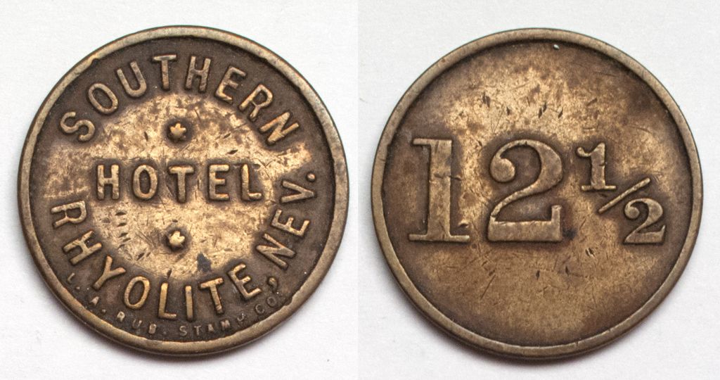 Run by W. P. McCauley, the Southern Hotel was one of ten or so hotels in Rhyolite. This brass token, 12 1/2c, would have probably bought you a drink at the hotel bar. Rhyolite was founded in 1904 and by 1916 was virtually deserted. Rhyolite tokens are scarce. From the Maish Collection of Nevada Tokens!City: RhyoliteCounty: NyeState: NVDate: