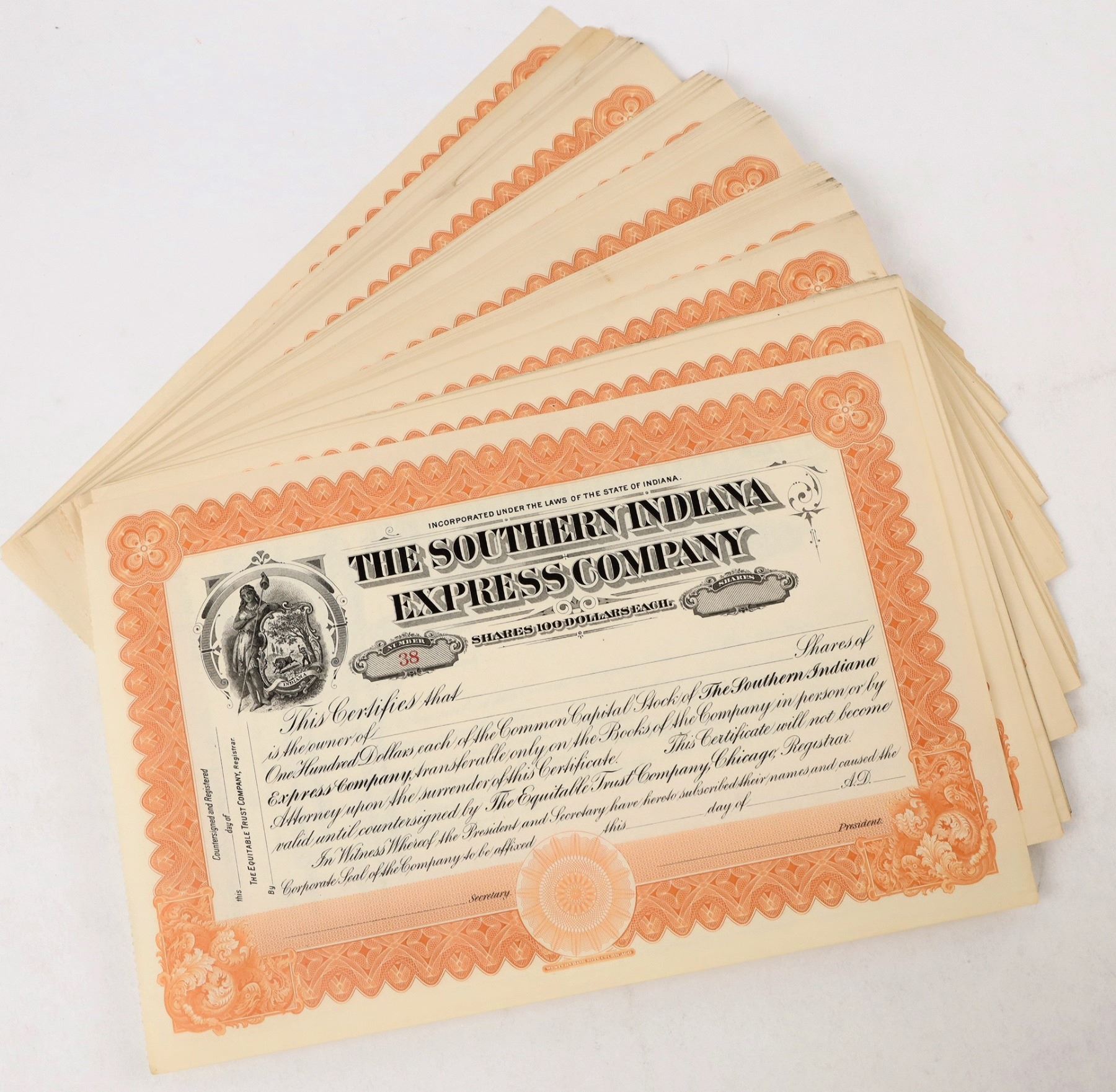 Southern Indiana Express Company stock certificates, orange border, unissued, ~80 pcs. #38-123 partial sequence, 11.875 x 7.8125 in.
