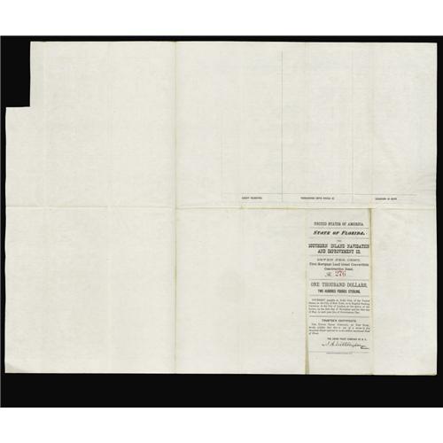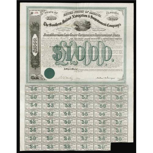 <B>Southern Inland Navigation & Improvement Company. $1000 / <$200</B></I><BR>Florida, $1,000/<$200 Bond, 7%, 1871. Printed by Cowan & Co, NY, 47 of 66 coupons attached. Uncancelled. Exceptional and so very rare. <B>Extremely Fine.</B></I> <BR><BR><B>Important notice:</B> Heritage usually auctions material at the rate of 200-250 lots per hour. On some occasions eBay Live bid software or the Internet may not be able to keep up with the pace of the auction. We recommend placing a realistic absentee bid now as insurance to avoid disappointment. Occasionally the auctioneer may eliminate or reject an eBay Live bid, and the auctioneer may also reopen a lot after the close of the eBay live bidding (usually because we missed an audience bid), and may reject your bid even if it shows you as the winning bidder. By bidding via eBay Live, you agree that Heritage may award the lot to another bidder at its sole discretion under the circumstances described above or any other reasonable circumstances. Since eBay bids are not shown to us until we open the lot on the floor, we treat those bids just like floor bids. In most cases the floor responds before the eBay bid is presented to us, due to Internet lag time, so for consistency we have made it a policy that floor bids are always considered first over tie eBay live bids. Also please note that all Heritage lots purchased through eBay Live carry a 20% Buyer's Premium. Please make sure you read the Terms and Conditions before you bid. This lot is being auctioned in conjunction with a live floor auction by Heritage Galleries & Auctioneers. All final auction and invoice information will be supplied by Heritage Galleries & Auctioneers, and all other information should be considered preliminary. Lot:15657 <BR><BR><B>Winning Notification and Billing:</B> After the FINAL session in this auction is complete, Heritage will send e-mail and snail mail invoices. This process normally takes several days. All final auction and invoice information will be supplied by Heritage Galleries & Auctioneers, and all other information should be considered preliminary. <BR><BR>This auction will be conducted on a live auction floor and over the Internet through eBay Live. If you choose to place an absentee bid, please take a moment to <font color='#0000ff'><u><a href='http://pages.ebay.com/liveauctions/help/before/laabsentee.html'>learn how eBay Live absentee bidding works</a></u></font><font color='#000000'>