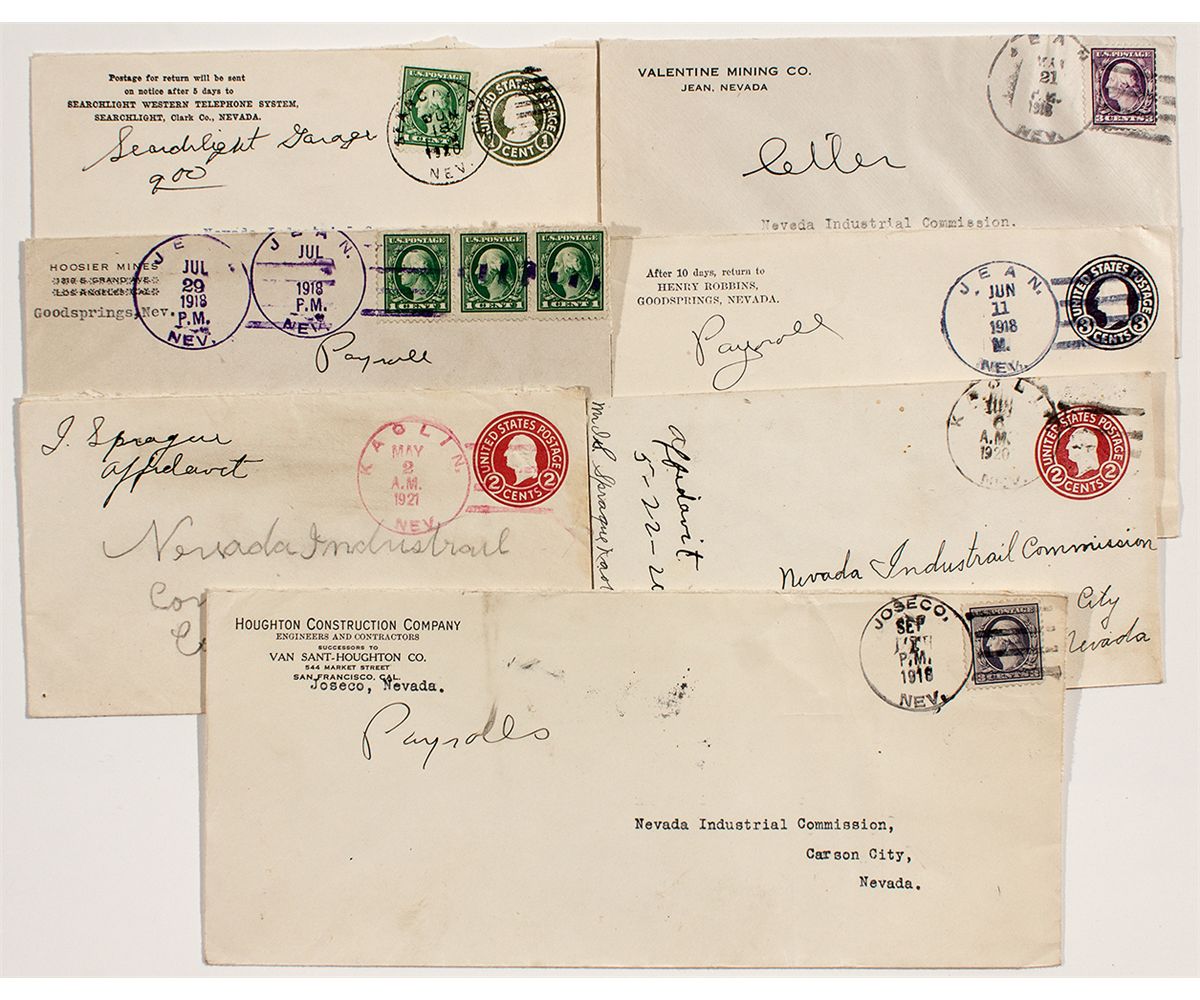 c1918 lot of about 10 covers from the southern area of Nevada. Towns included are Jean, Boulder CityPittman Caliente and Henderson. Two of the covers from Jean are cancelled in purplr ink large circles. This is a part of former State Treasurer Dan Franks' cover collection. - HKA#66000