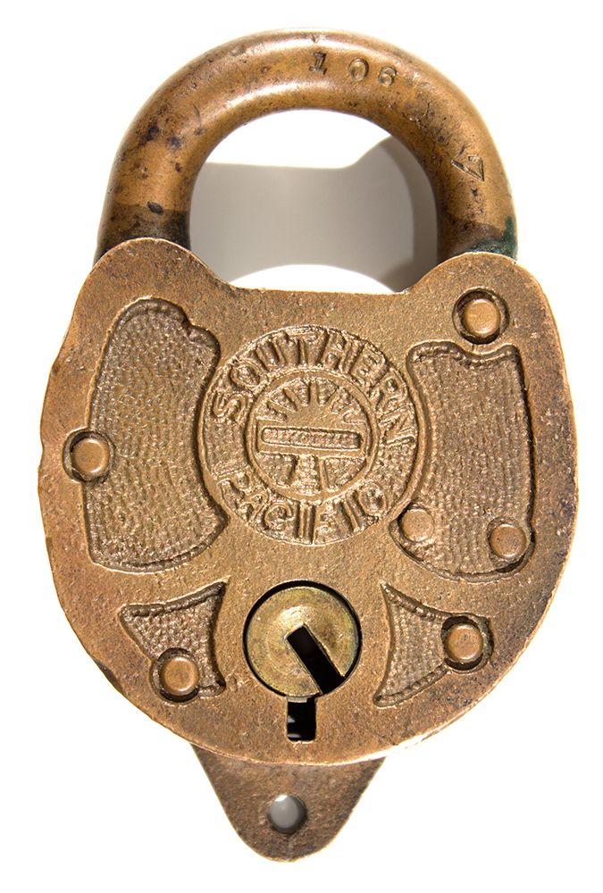 1906 This is a brass lock from the Southern Pacific Railroad’s train #7. The lock was used on the interior of the train and was not exposed to the elements. There is no key for the mechanism, but it is in very good condition and measures 3.25”x 2.25”. This would make a great addition to any railfan’s collection. - HKA#65326