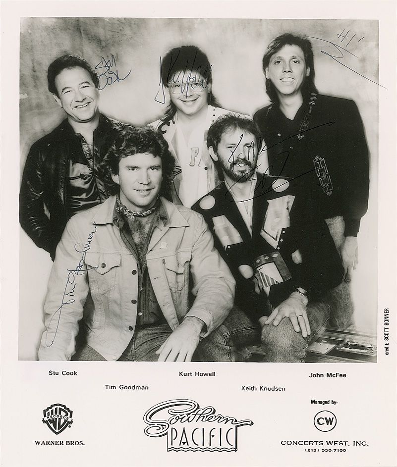 Satin-finish 8 x 10 Warner Bros. publicity photo, signed in black ink by Stu Cook, Tim Goodman, Kurt Howell, Keith Knudsen, and John McFee. In fine condition.