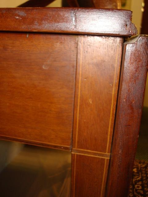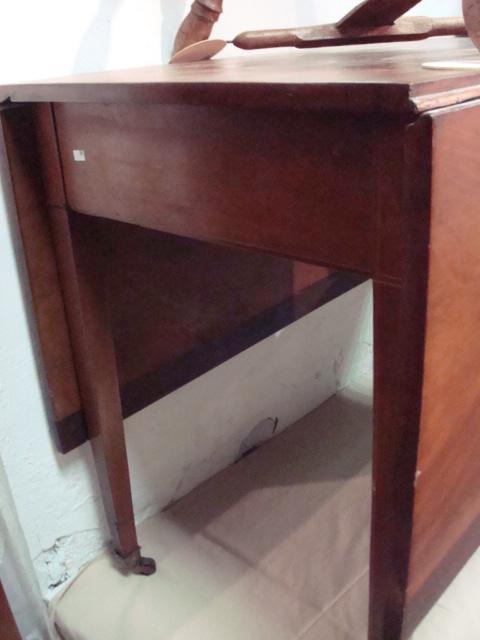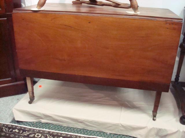 Southern Pine Drop Leaf Table:29 1/4"T, 41 3/4" X 20" Solid One Piece Top with 181/2" Drops. Square Tapered Legs Ending in Brass Castors. Line Inlay on Sides and Legs. End of Drops are a Darker Wood. (Small Old Crack In Top). (140-300)