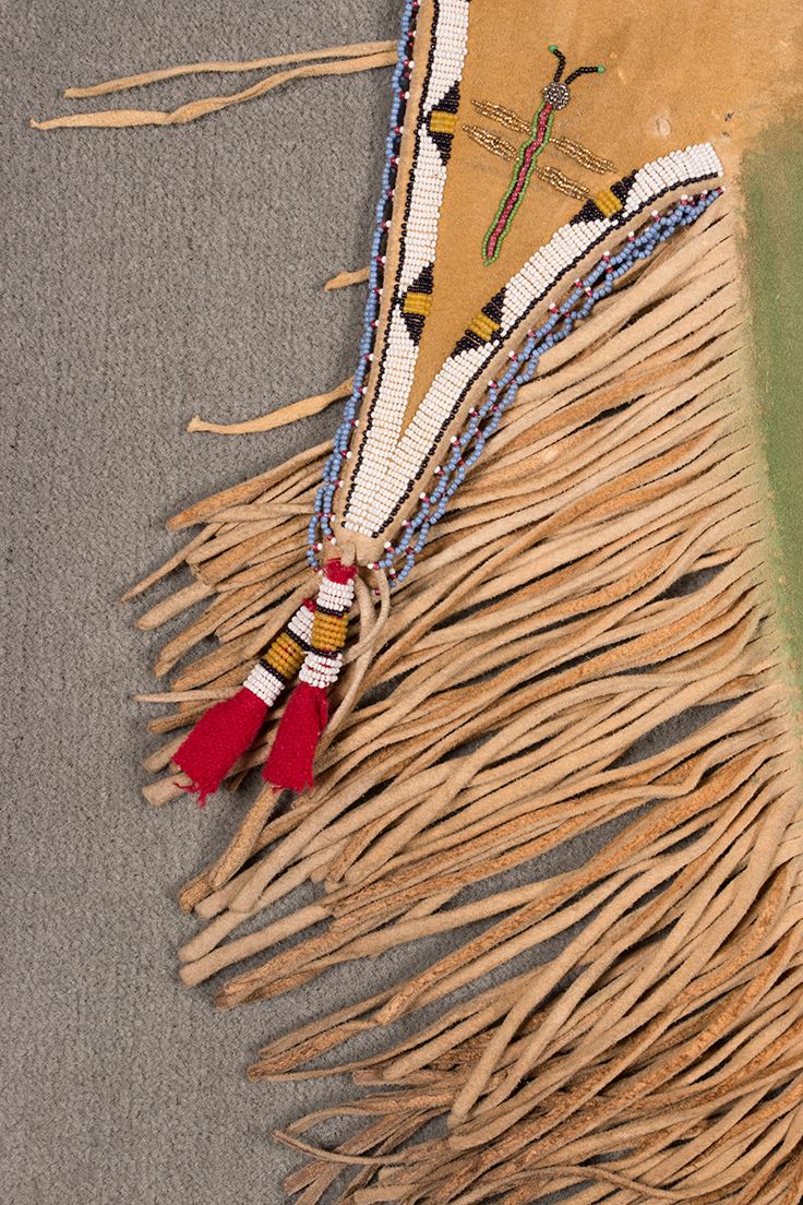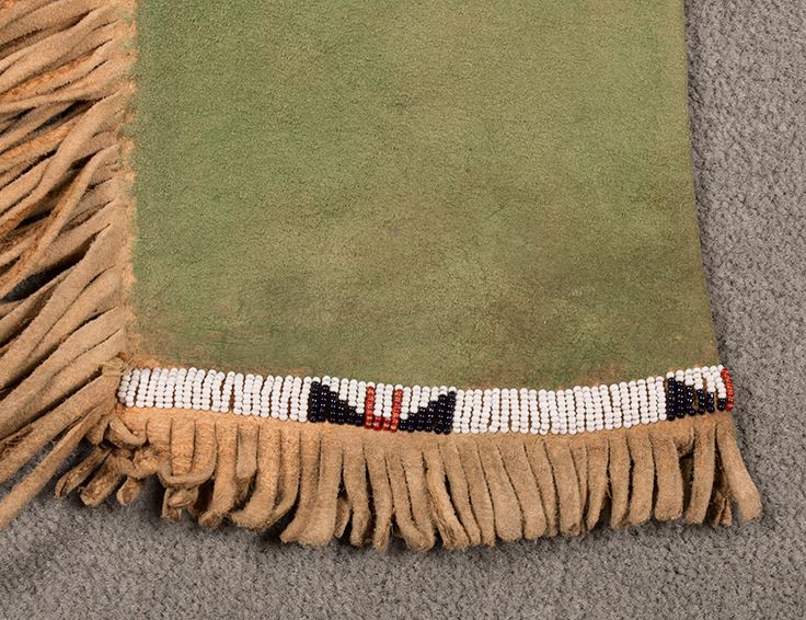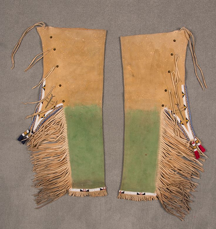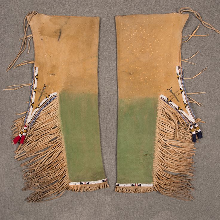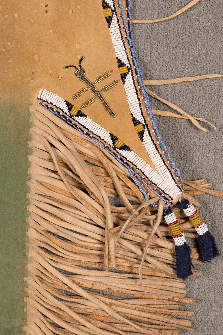 Southern Plains Beaded Leggings on Buffalo Hide. 32" x 12". Leggings are custom fitted using five metal studs on upper half. Lower half dyed green ochre, accented with 7" fringe. Top half is accented by spectacular beadwork in the form of fancy edging in red, white and blue, multi-colored dragonflies, and drops stuffed with cloth. 19th century.