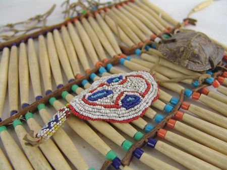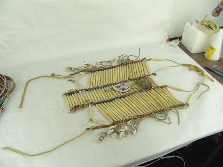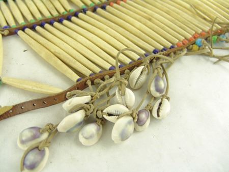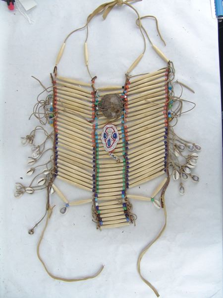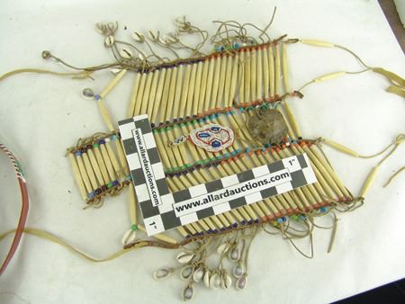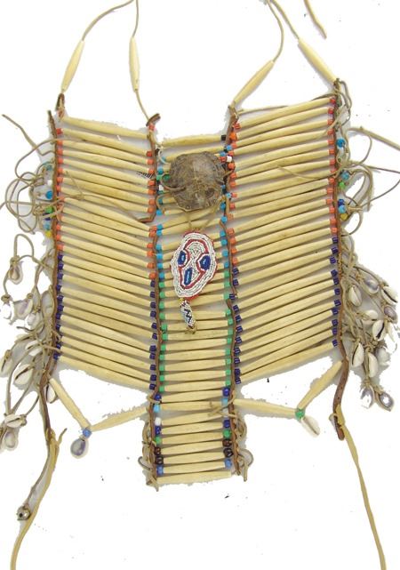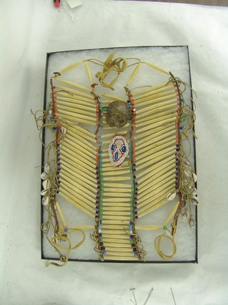 Mid 1900s, Hand strung (partially re-strung) breast plate made with beautiful antique 2-1/2", 3", and 4" bone hair pipes, and with beads, a turtle shell amulet, and beaded fetish attached. Good condition, complete but has some broken spacers and needs to be restrung. 16"