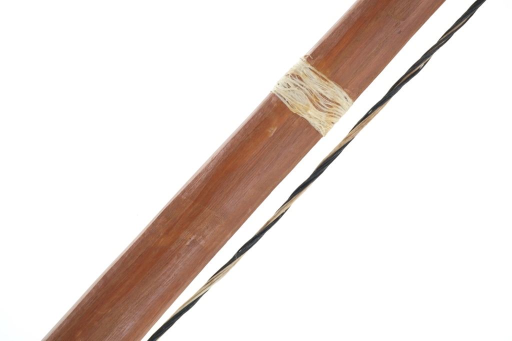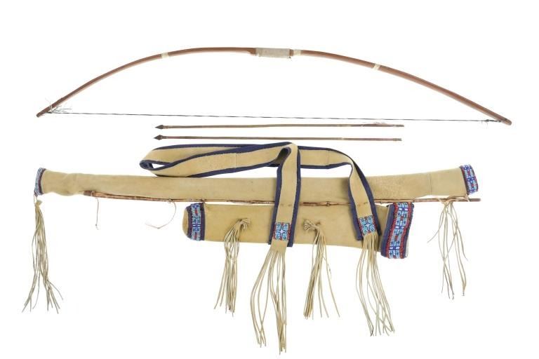 The lot features a nice, mid-1900's Southern Plains beaded bowcase, quiver, bow and arrows set. The set shows a carved wooden bow with sinew wrappings, hide wrapped sinew sewn gripping area and the original sinew or sinew like woven string still intact, bowstring is present and can be set on bow as shown. Collection includes two arrows with sinew wrapped iron tip arrowheads with sinew wrapped feather fletching and a red and yellow ocher painted finish. Arrows appear to be earlier, circa 1890-1920's. The bowcase / bow case and quiver is comprised of tanned hide with trade clothe showing sections of glass trade seed bead loom beadwork with stepped cross designs as well as long frilly fringes and braided horse tail hair fringes. The beadwork wraps around the quiver opening and end as well as the bow sheath opening and end and at the bottom of the shoulder strap ends. There is a stripped wood stick frame piece which is tied with sinew . A beautiful set that displays beautifully. The bow is 50-inches long. Arrows are 25.5--inches long. Overall the bowcase and quiver with strap is 56-inches tall and is 52-inches wide with bow.