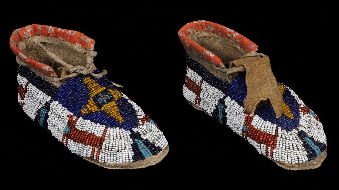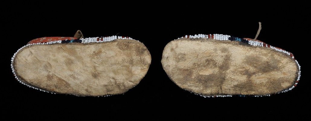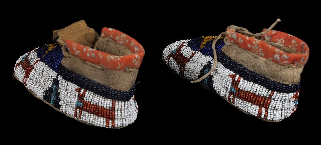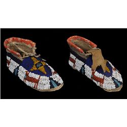 Southern Plains Cheyenne Child's Moccasins, Fully Beaded with Dog and Geometric Design Sinew Sewn on
