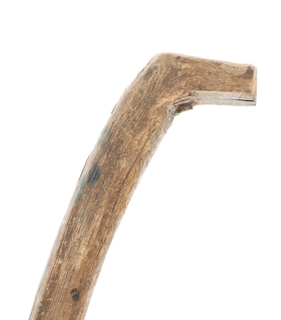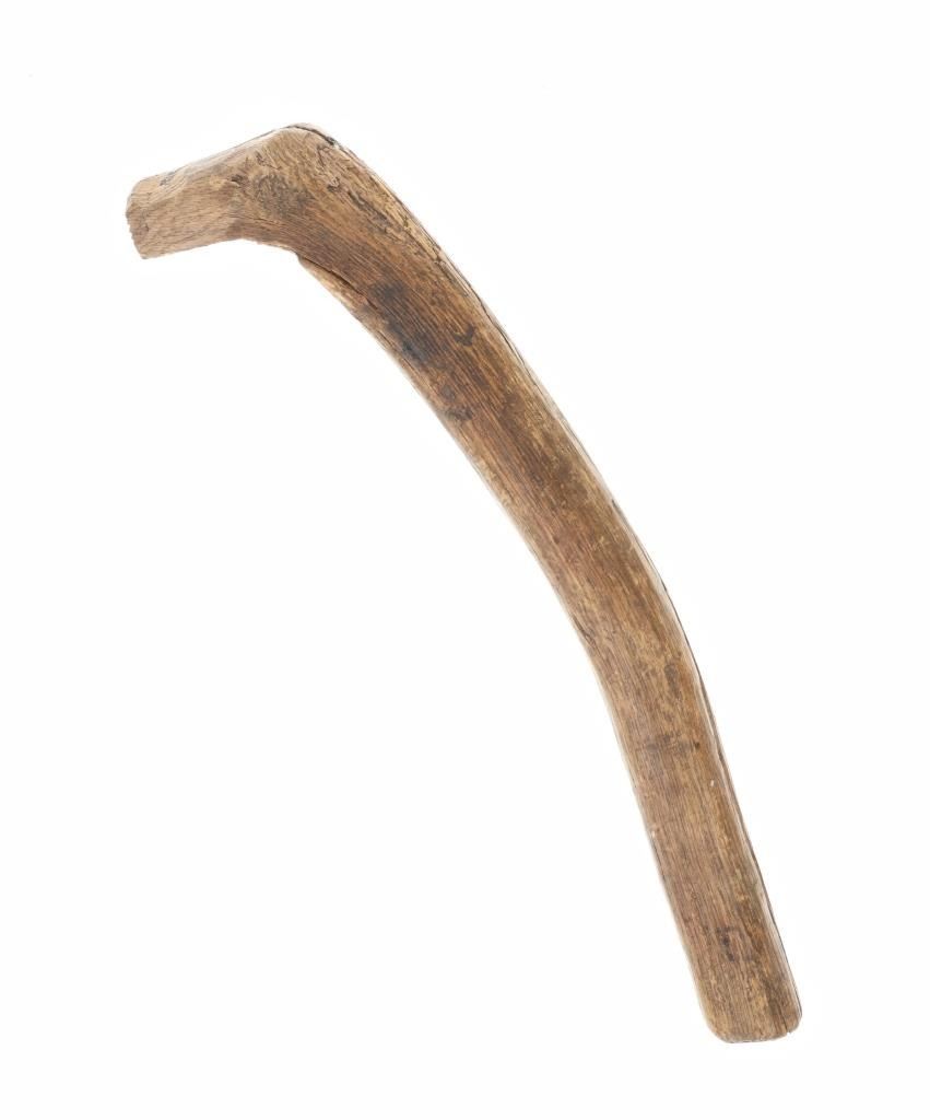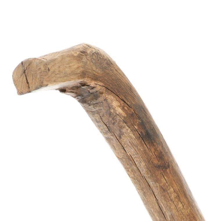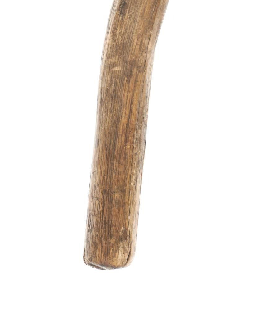 Featured in this lot is this traditional hand carved and shaped Southern Plains wood adze scraper circa late 19th century. The piece is constructed from a piece of wood that has been carefully carved and shaped. The piece shows the typical drastic right turn top which would have originally held a gun barrel or bit of old iron blade adhered to the end with parfleche rawhide wrappings, which is now missing. The piece shows good condition overall with wear present from its age and use over the years. It measures 14" L x 1 1/2" W x 3 3/8" D and weighs 8 ounces.