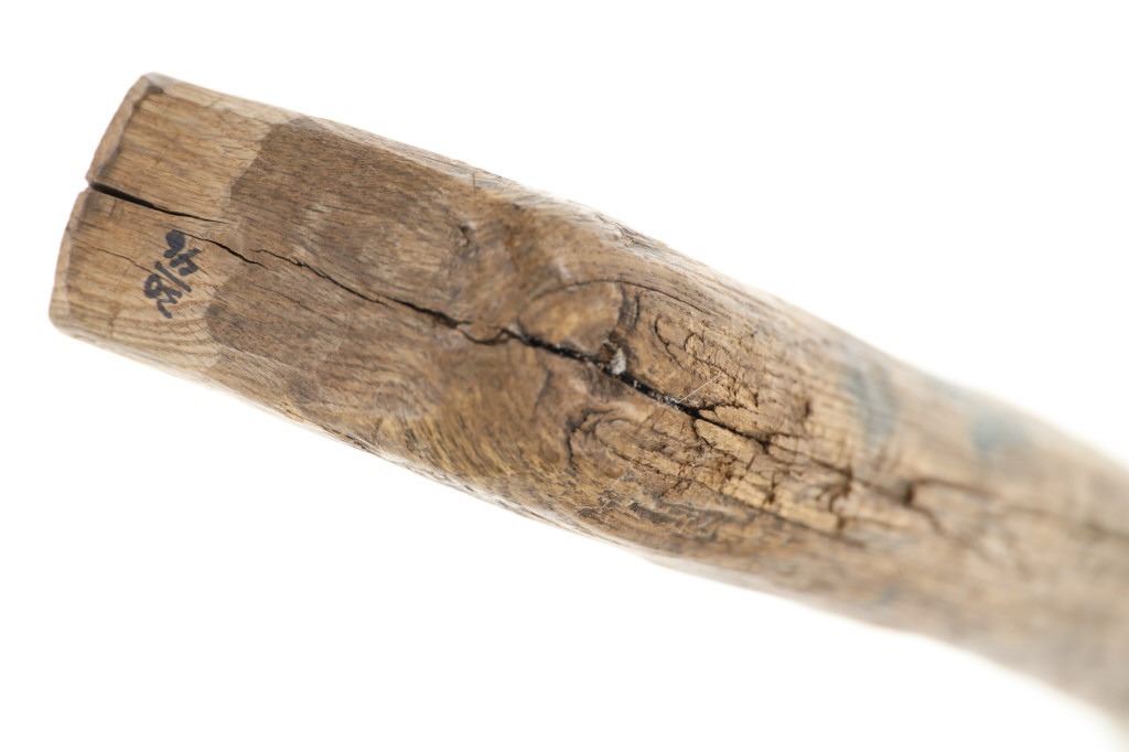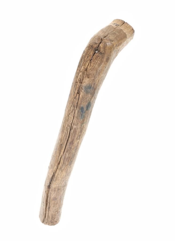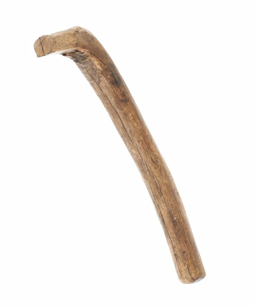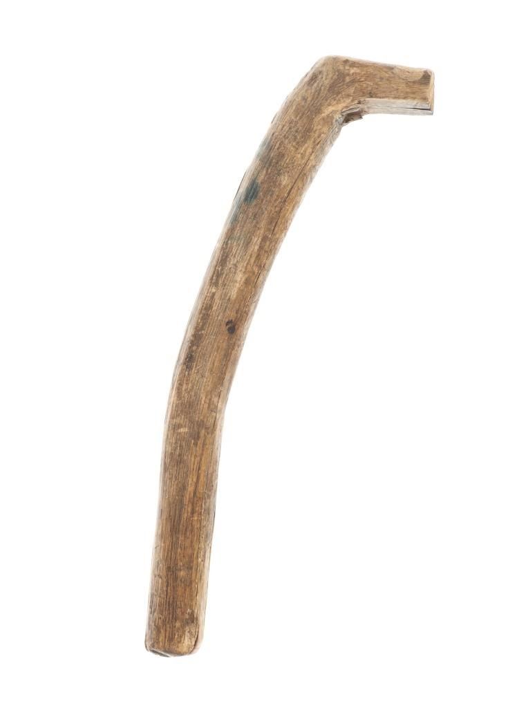 Featured in this lot is this traditional hand carved and shaped Southern Plains wood adze scraper circa late 19th century. The piece is constructed from a piece of wood that has been carefully carved and shaped. The piece shows the typical drastic right turn top which would have originally held a gun barrel or bit of old iron blade adhered to the end with parfleche rawhide wrappings, which is now missing. The piece shows good condition overall with wear present from its age and use over the years. It measures 14" L x 1 1/2" W x 3 3/8" D and weighs 8 ounces.