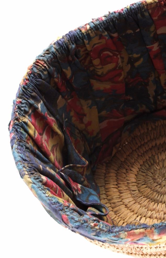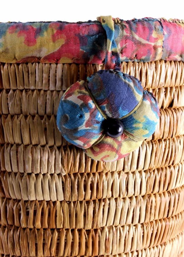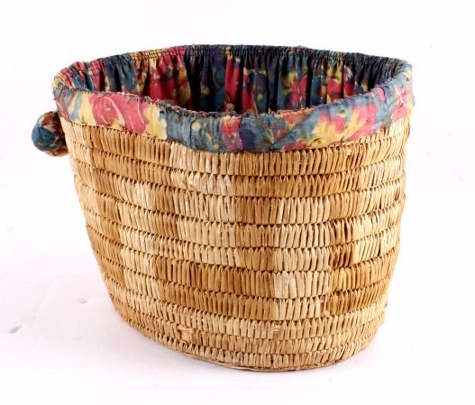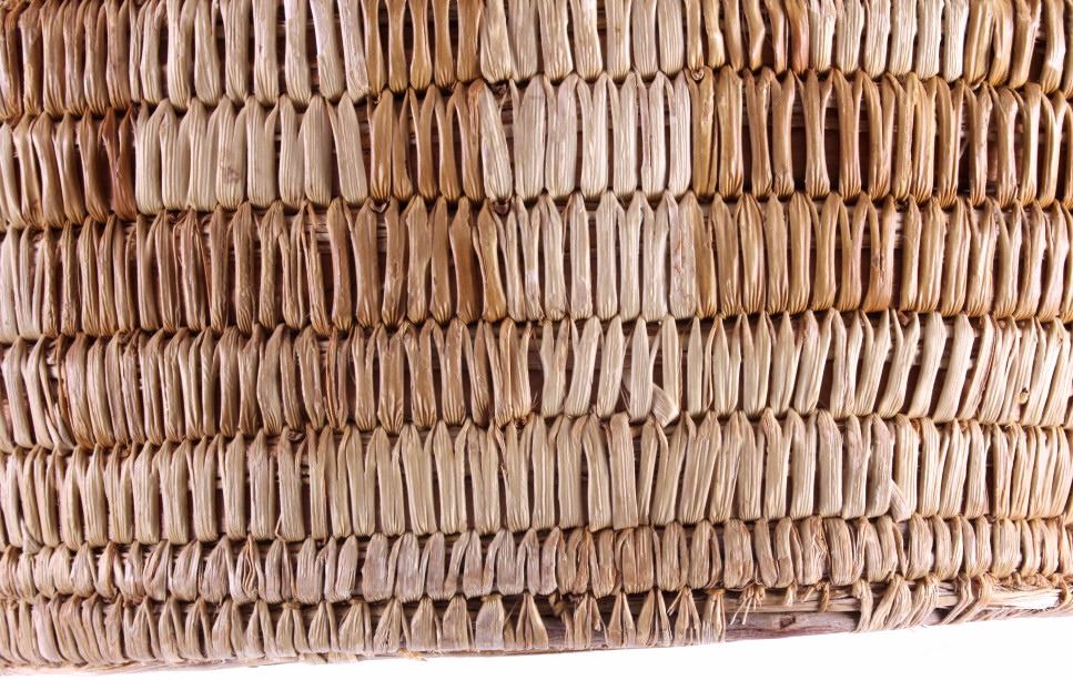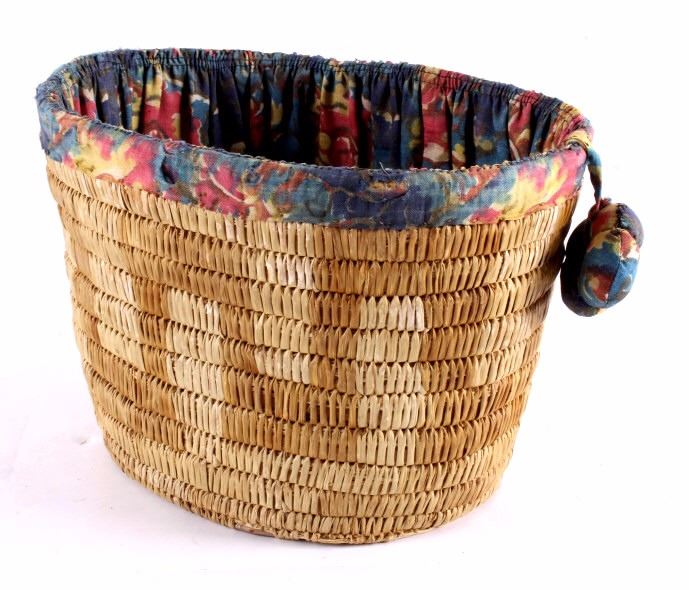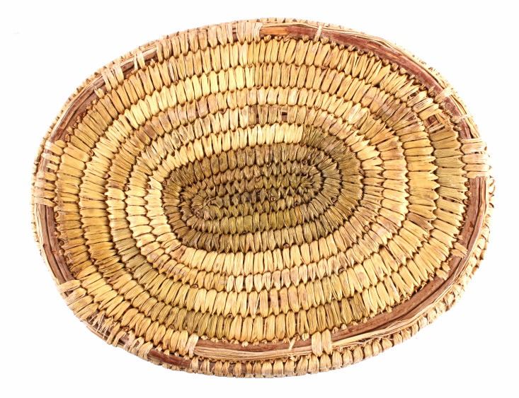 This is a Southern Plains Native American woven basket. The basket was hand made using natural grass fibers and has a fantastic design woven into the piece. The basket is in good overall condition. It measures 7" x 9.5" and is 7" tall.