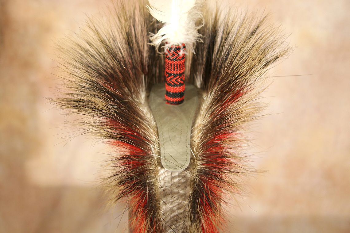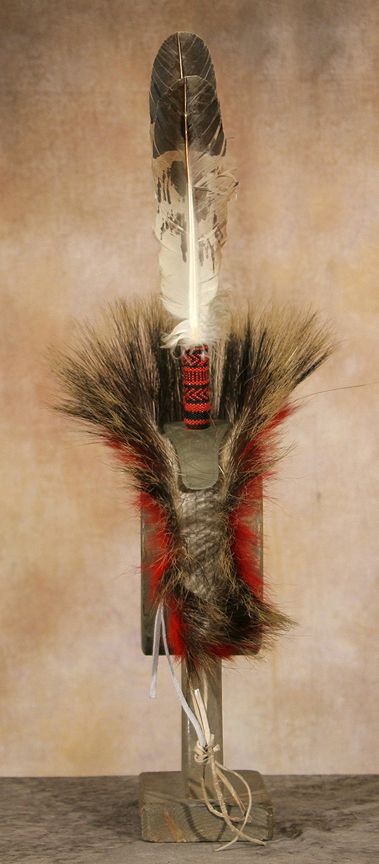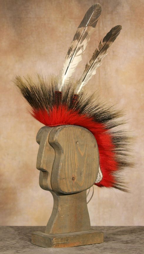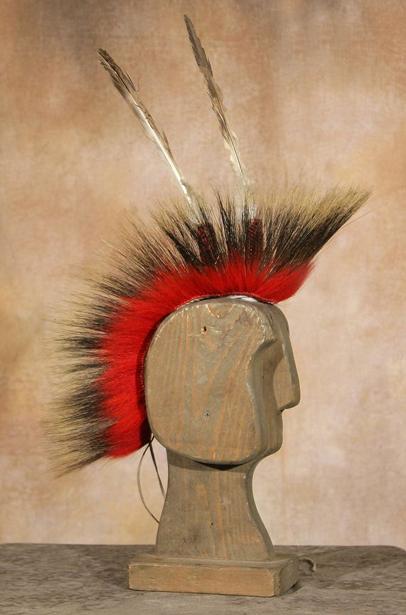 Southern Plains Roach. 12" long with boldly dyed guard hair & a German silver spreader, topped with two faux eagle feathers in beaded supports. Circa 1950s. Includes wood stand. (est. $400-600). CONDITION REPORTS: www.auctioninsantafe.com/docs/cr2012.pdf