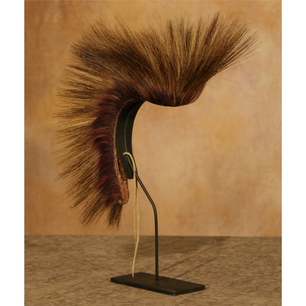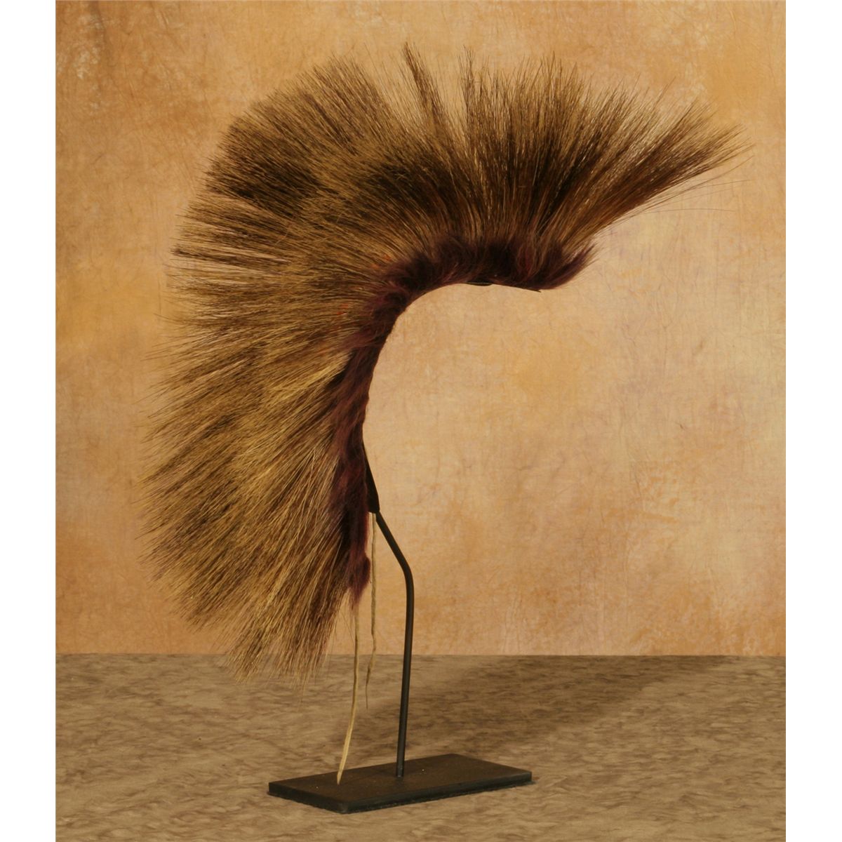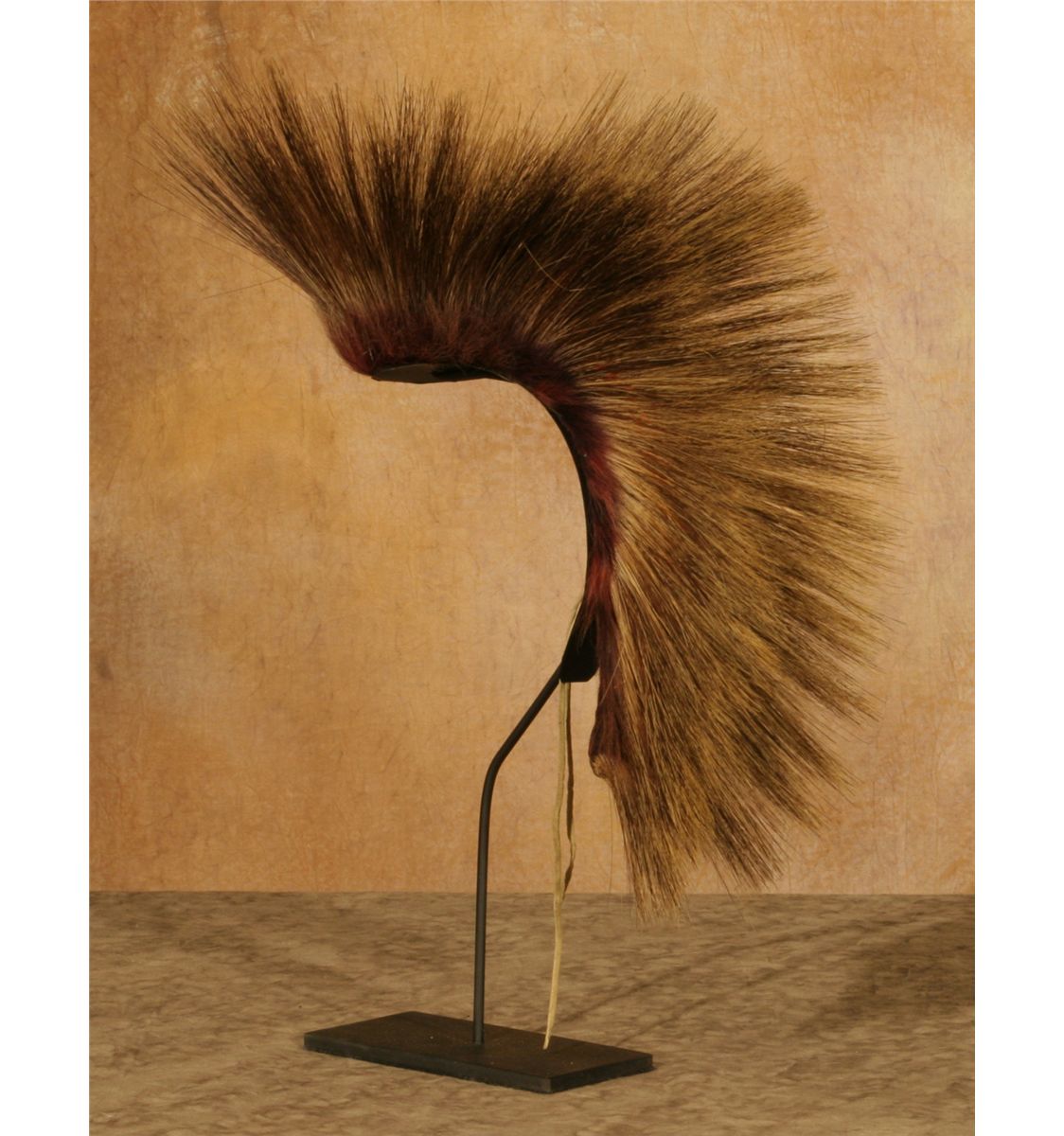 Southern Plains Roach. 12" long. Beautifully variegated porcupine guard hair on red and white deer hair base. Includes custom stand. Early 20th century.