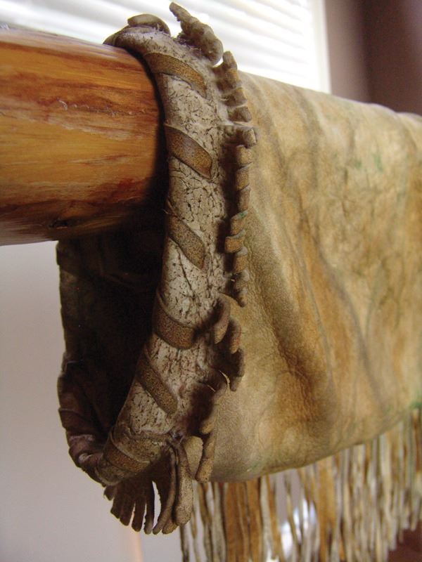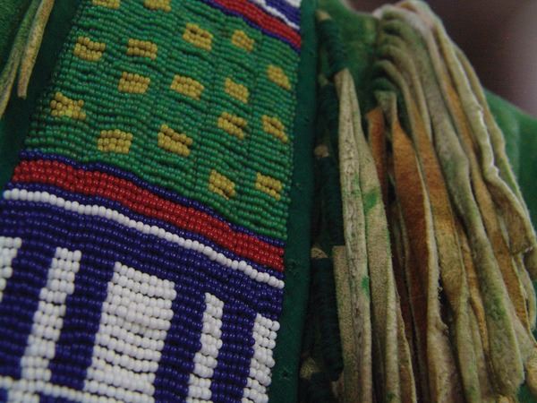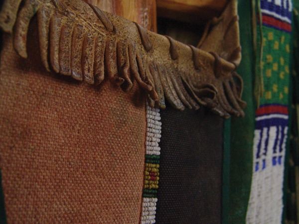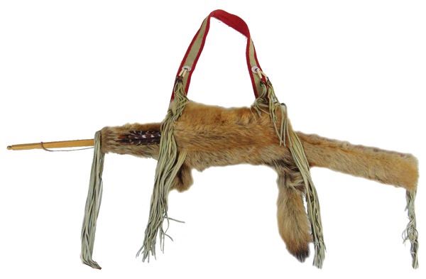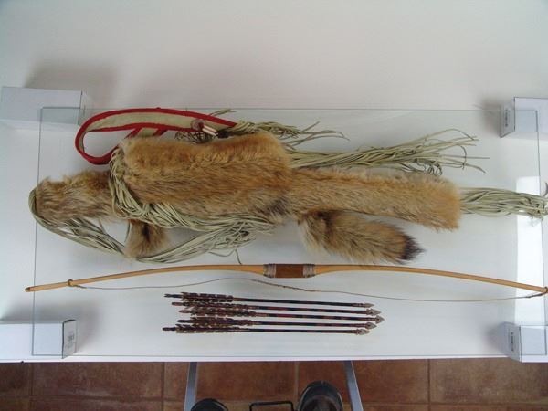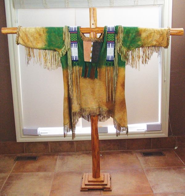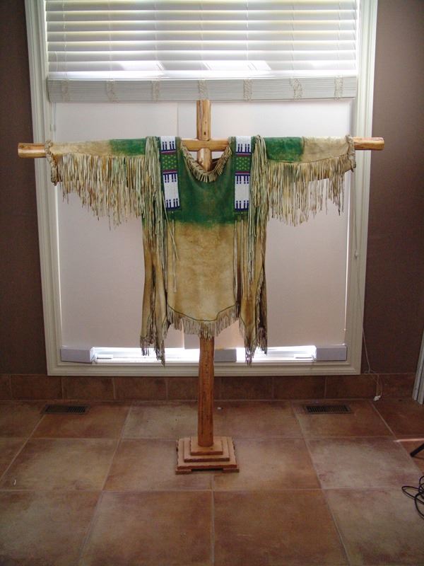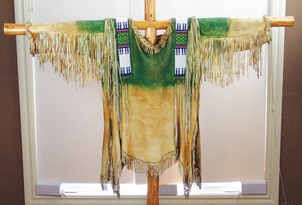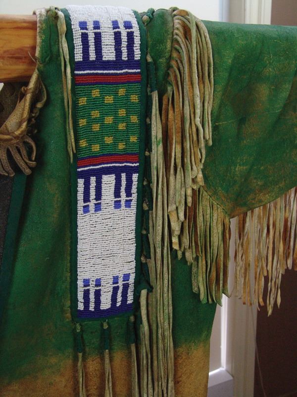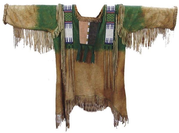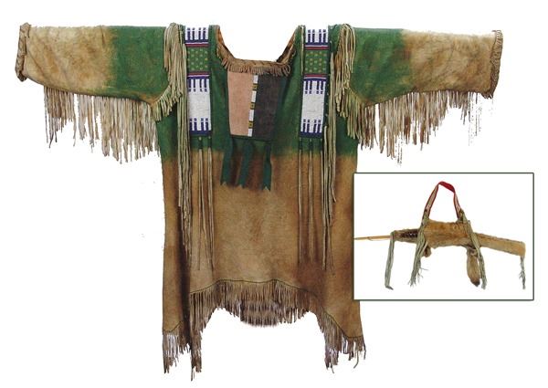 Picturesque, buckskin shirt with green ochre sections, lazy stitch beaded strips, two-color collar tab, and fringe, and with accompanying bow case, quiver, bows, and arrows. Very good condition.Ca. 1970s-1980s54" x 43"